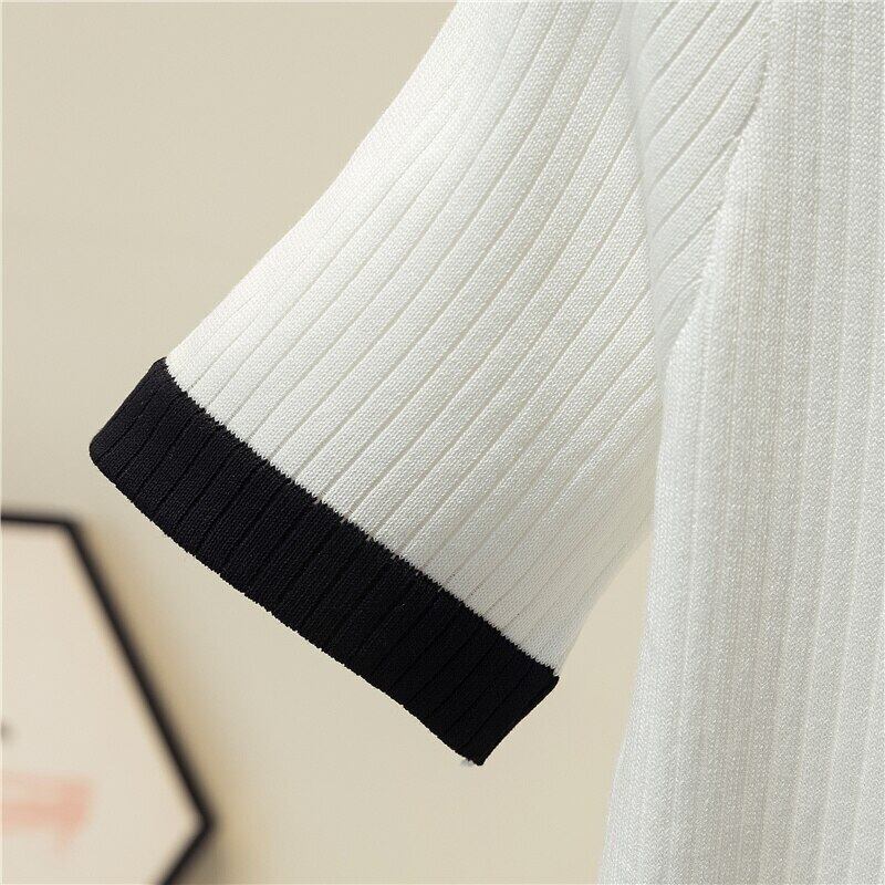 LJSXLS 2021 ニット女性半袖セータープルオーバー夏韓国パッチワーク女性 V ネックセータープルオーバースリムトップ ショート ハーフスリーブ サマー 夏物 Vネック Son33729664963