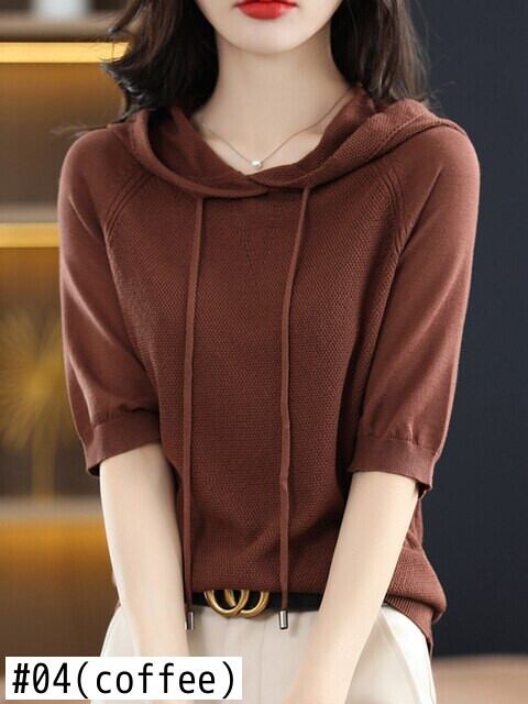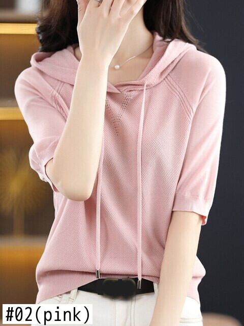 レディースフード付きプルオーバーセーター 2022 夏薄いトップス女性ルーズ服半袖ニットトップセーター ショート ハーフスリーブ サマー 夏物 Son56452576210