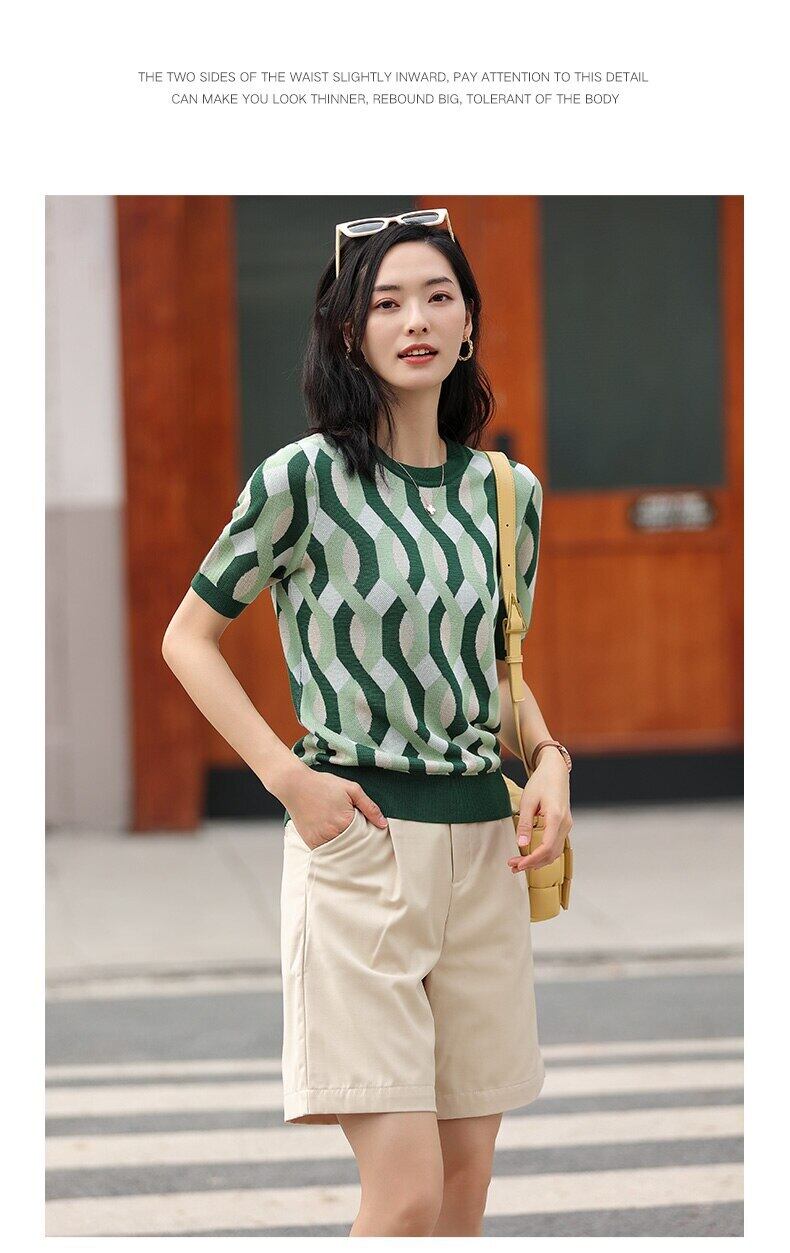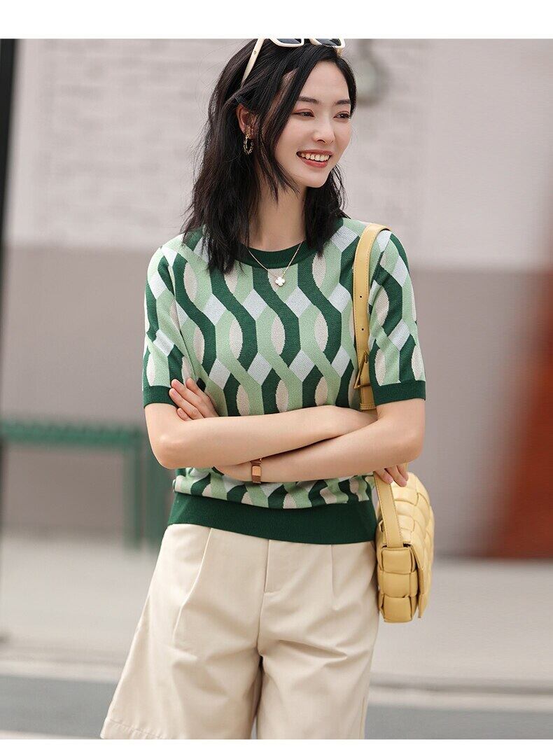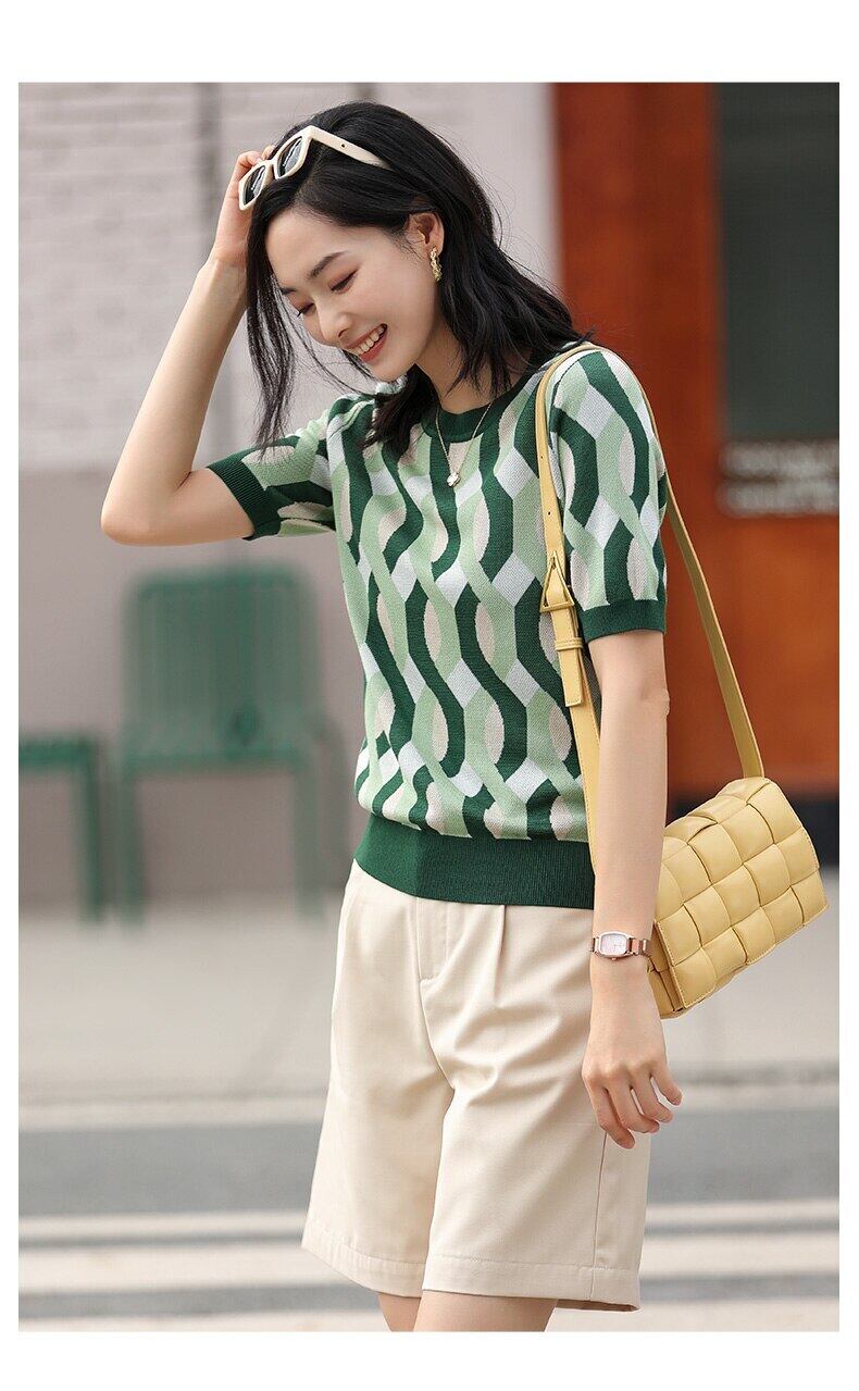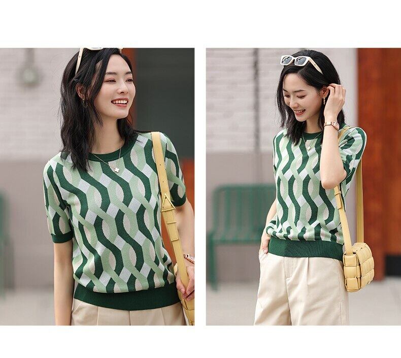 LJSXLS アイスシルクニットセーター女性ストライプ半袖夏緩い薄い O ネックプルオーバー 2022 秋トップス ショート ハーフスリーブ サマー 夏物 オータム 秋物 Oネック Son26131752857