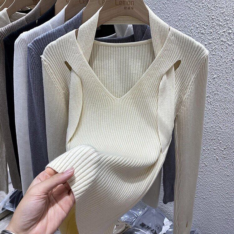 長袖の女性のセーター秋ニットプルオーバースリム V ネックジャンパー弾性冬レディーストップス黒プル 2022 ロング ブラック エラスティック 伸縮 オータム 秋物 ウィンター 冬物 Vネック Son61075227878