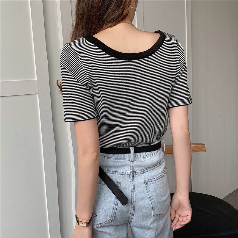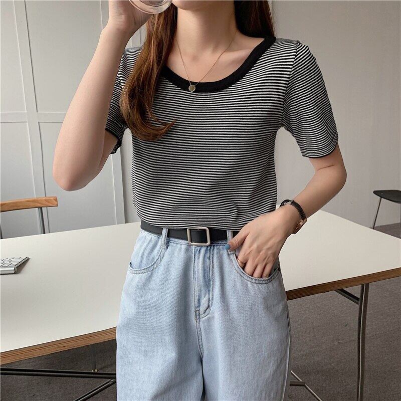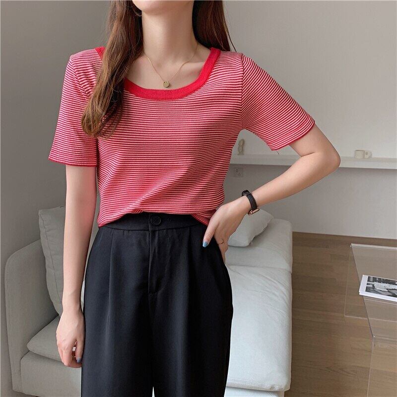 LJSXLS ストライプニットセーター 2021 夏服女性 O ネック半袖プルオーバークロップトップス女性セーター ショート ハーフスリーブ サマー 夏物 Oネック Son97285319210