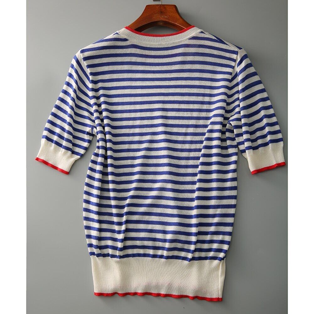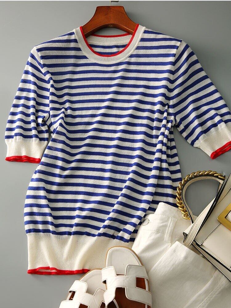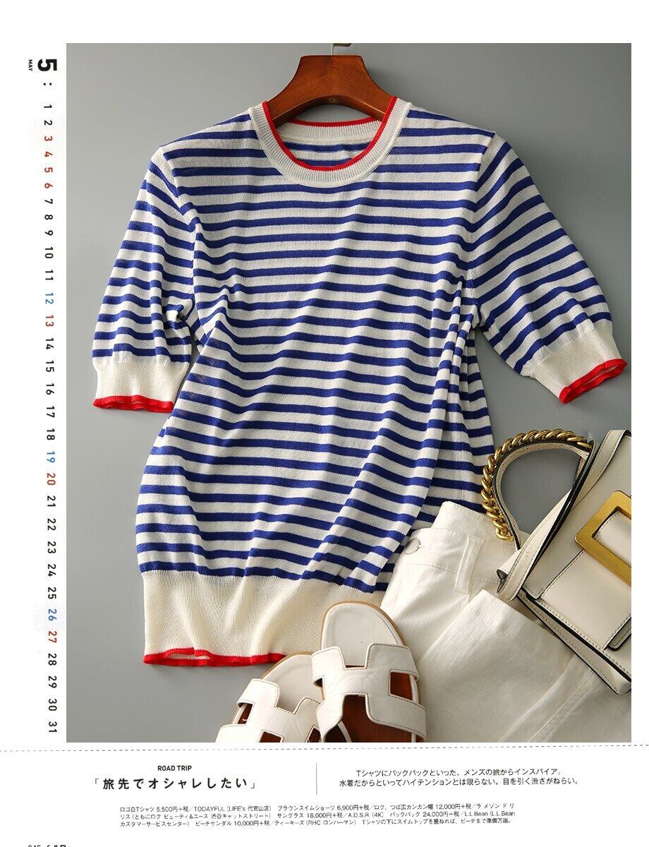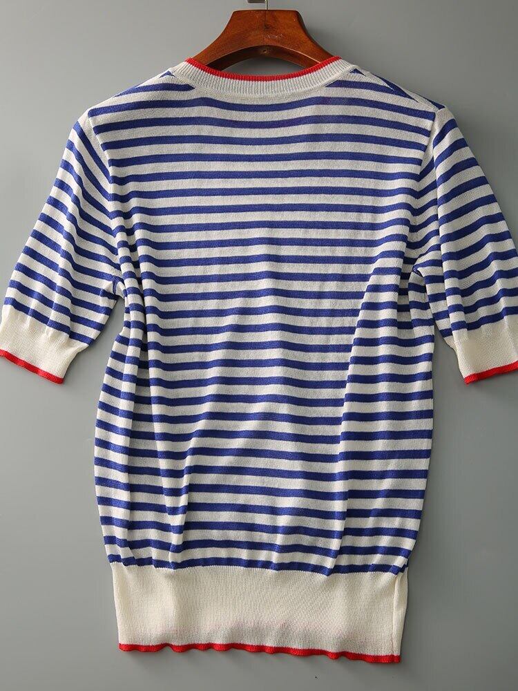 2022 夏プルオーバーニットトップス半袖ストライプ薄型セーター女性 O ネックの女性の服のセーターデ ショート ハーフスリーブ サマー 夏物 Oネック Son75200245646