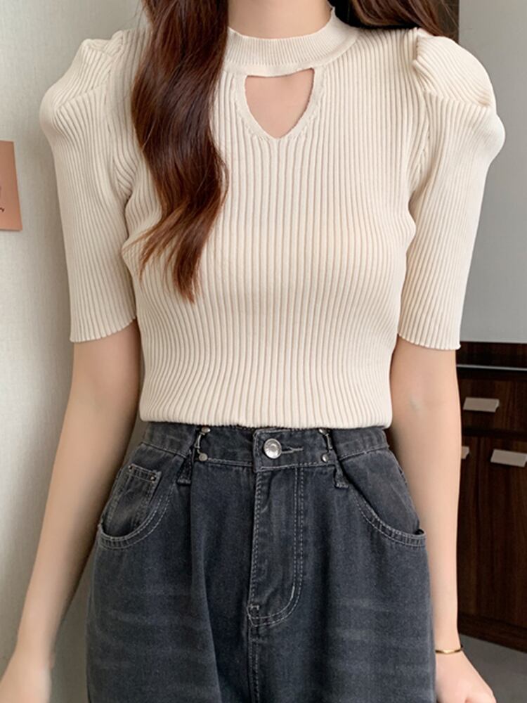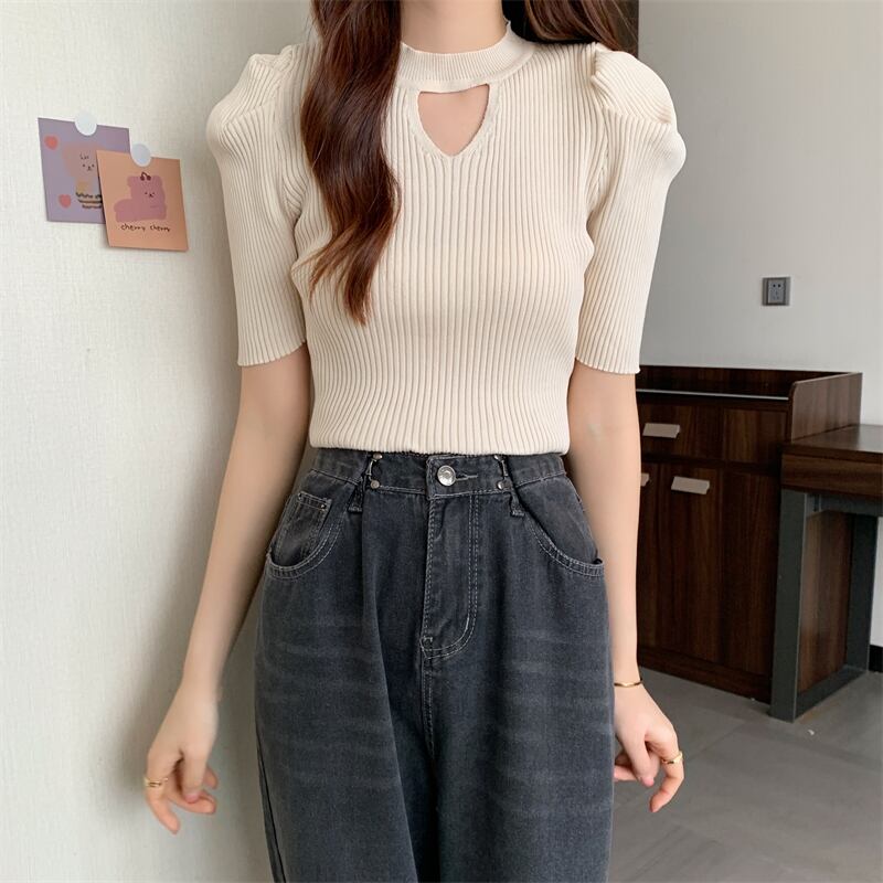 Camisetas デ中空アウトニット Tシャツ女性パフスリーブ Tシャツクロップトップス夏 Tシャツ婦人服 サマー 夏物 Son95990534187