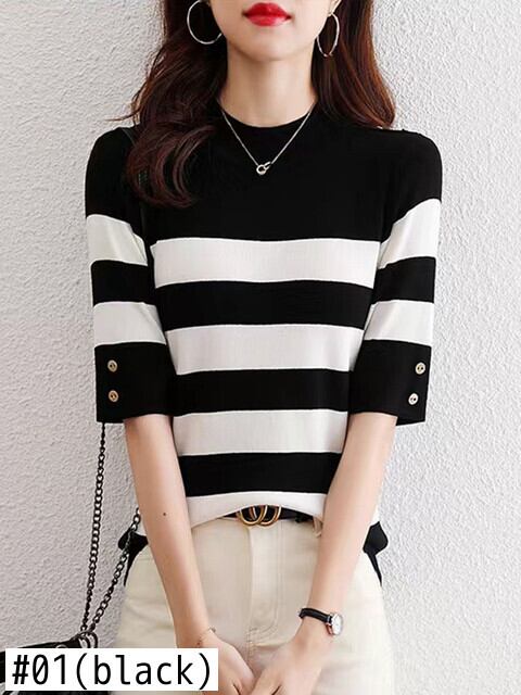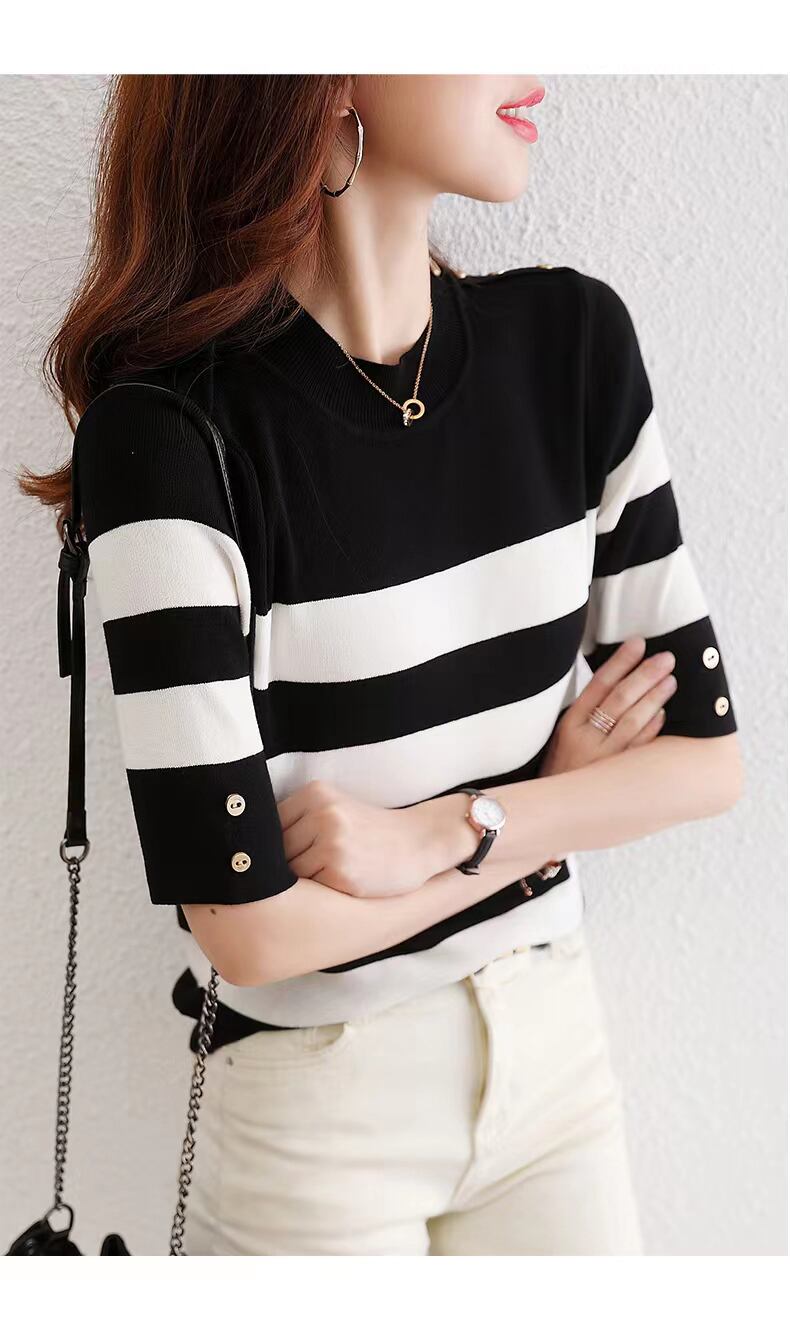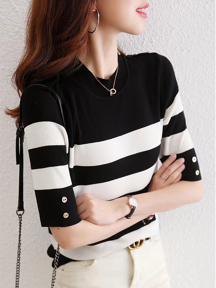 Tシャツ夏半袖 Tシャツ女性レディースニットトップスストライプ O ネック Tシャツ Camisetas ショート ハーフスリーブ サマー 夏物 Oネック Son56482041056