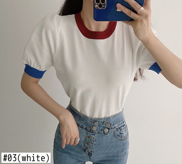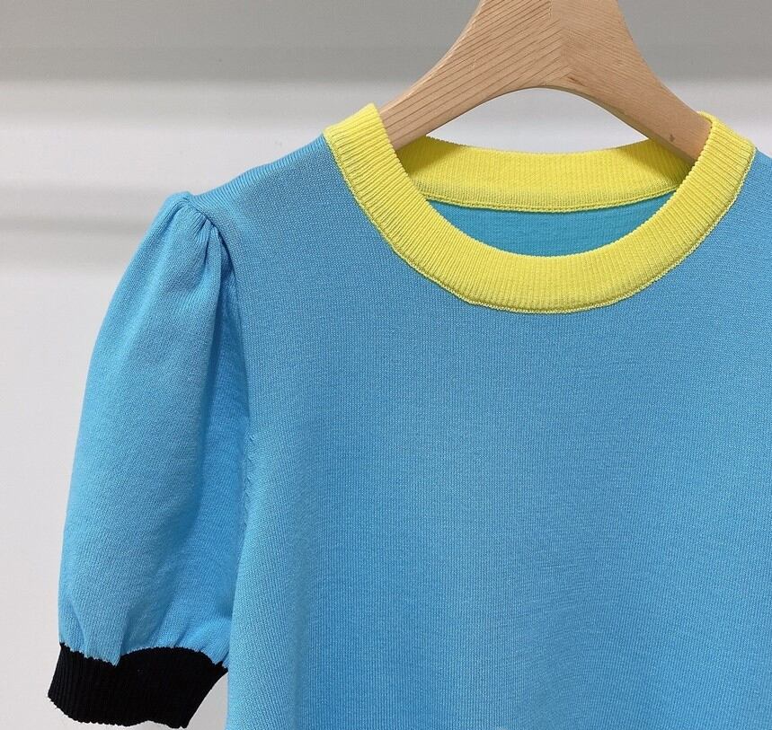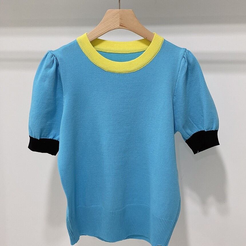スタイルスリムニットトップスジャンパー女性セーター夏薄型 O ネックセーターレディースコントラストカラー半袖 ショート ハーフスリーブ サマー 夏物 Oネック Son98953940580