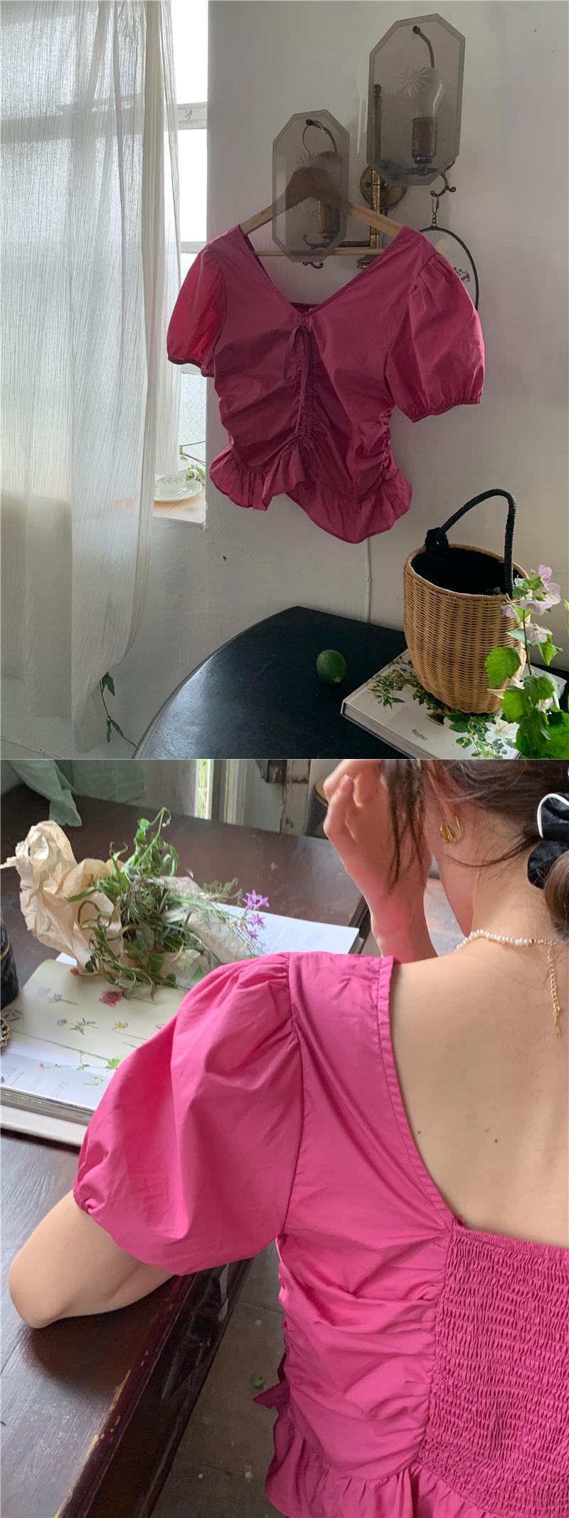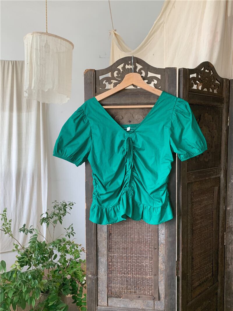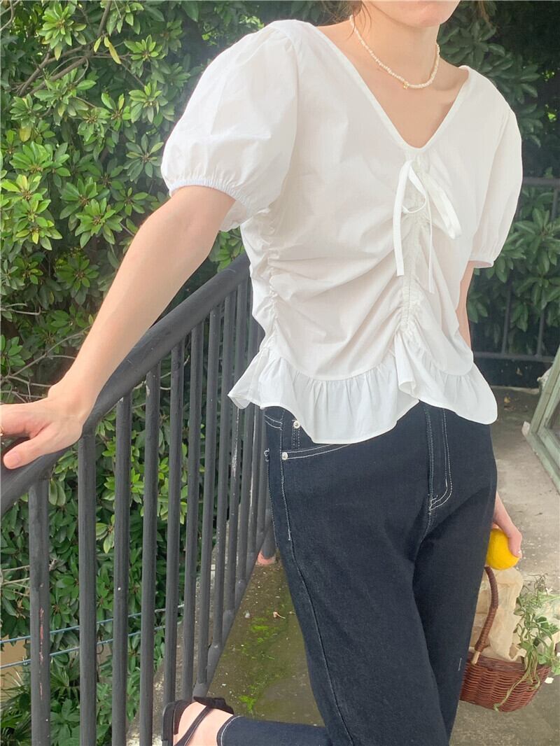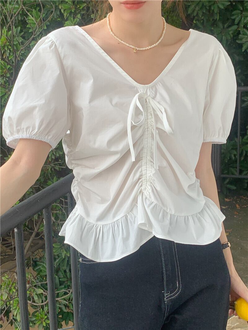 スタイル フリル V ネック トップ半袖白ブラウス女性服スリム シャツ女性夏 ショート ホワイト ハーフスリーブ サマー 夏物 Vネック Son98948604111