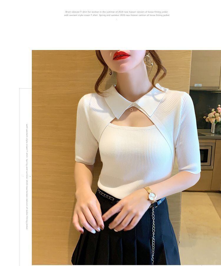 夏白 Tシャツターンダウン襟セクシーな中空アウトニット Tシャツ女性半袖 Tシャツトップス婦人服 ショート ホワイト ハーフスリーブ サマー 夏物 Son39695101475