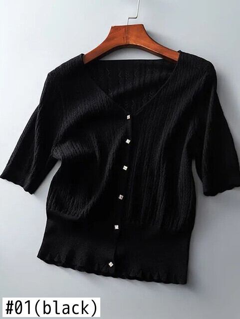 アイス Tシャツニット女性服固体薄型半袖 Tシャツ中空アウト Tシャツ夏 V ネックカーディガントップス ショート ハーフスリーブ サマー 夏物 Vネック シルク ソリッドカラー Son98876191631