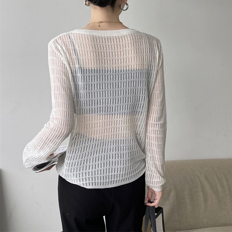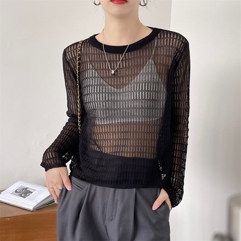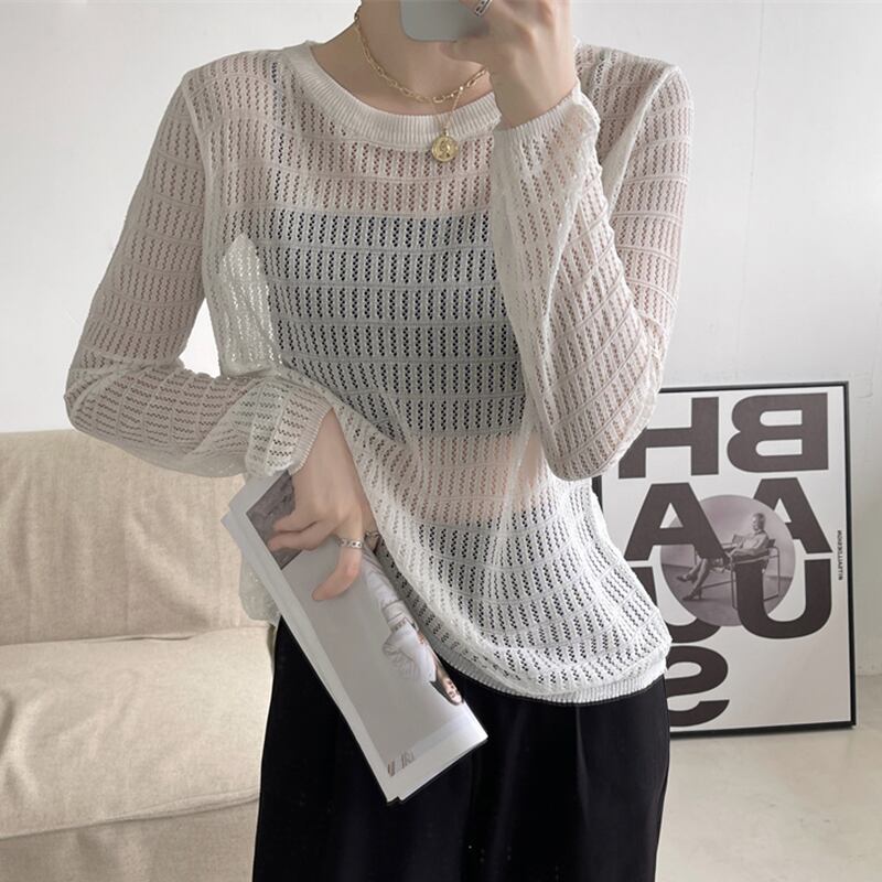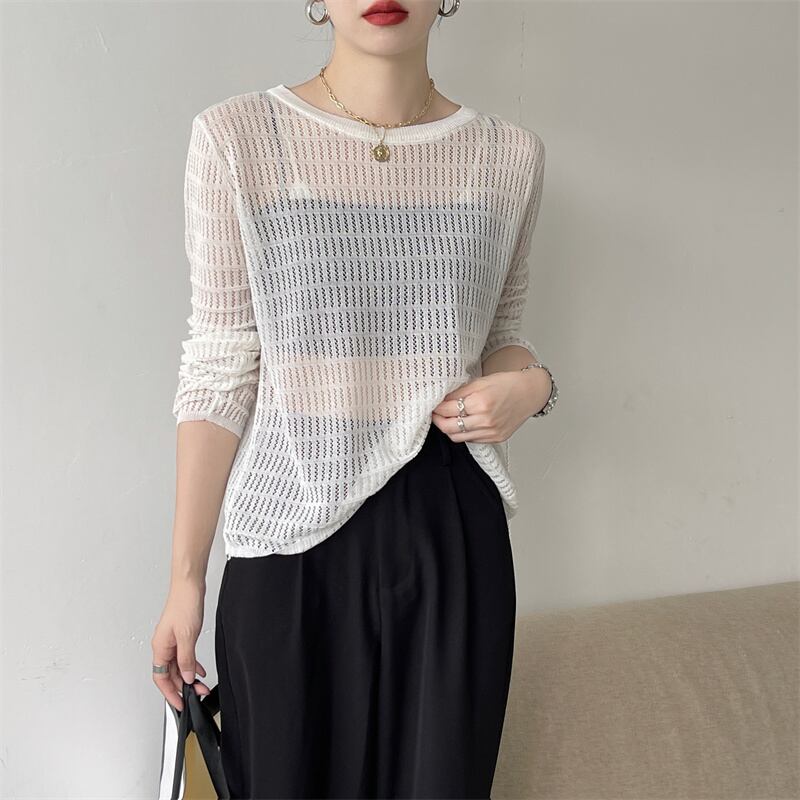 長袖ルーズニット Tシャツ女性中空アウト夏薄いトップス Camisetas Tシャツレディース ロング サマー 夏物 Son40377604987