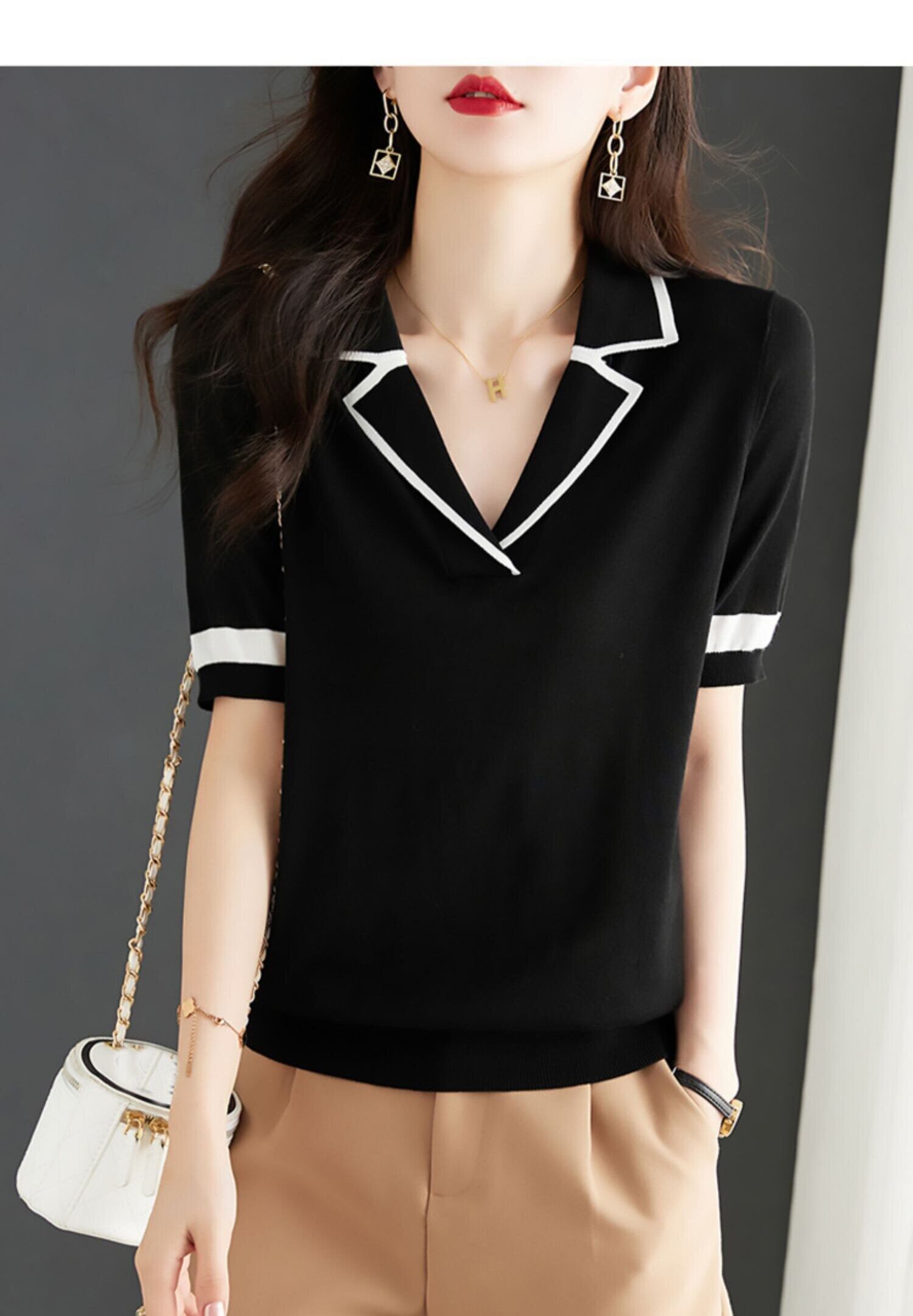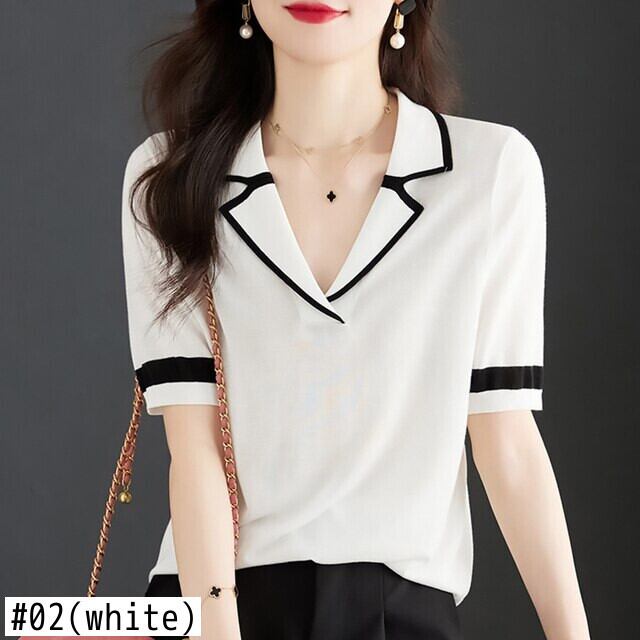 黒、白パッチワーク緩いニット Tシャツ Tシャツ半袖トップススタイル服夏 Tシャツシャツ ショート ホワイト ブラック ハーフスリーブ サマー 夏物