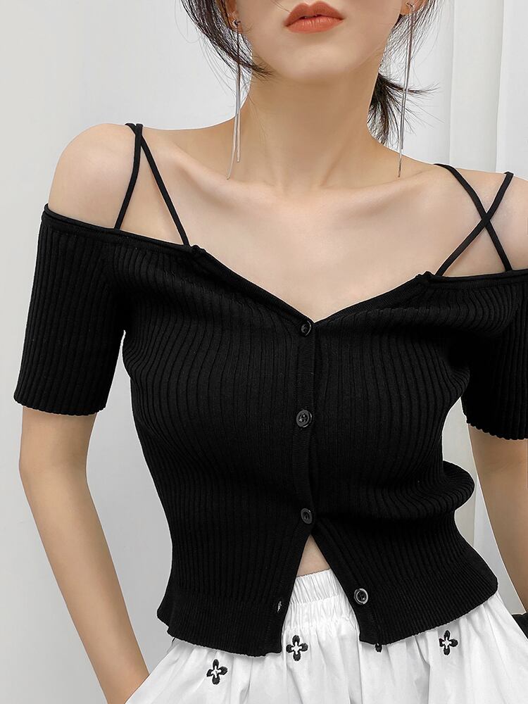 夏のストリート Tシャツセクシーなスリムオフショルダーニット Tシャツ半袖白黒クロップトップス Tシャツ ショート ホワイト ブラック ハーフスリーブ サマー 夏物