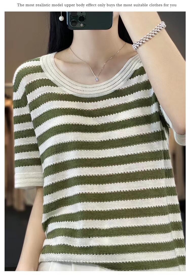 ストライプ Tシャツニット半袖トップス O ネック中空アウト Tシャツ夏薄型ルーズ Tシャツ Ropa デ ショート ハーフスリーブ サマー 夏物 Oネック