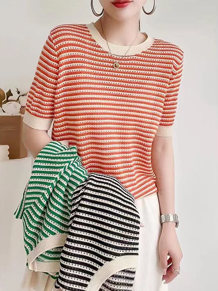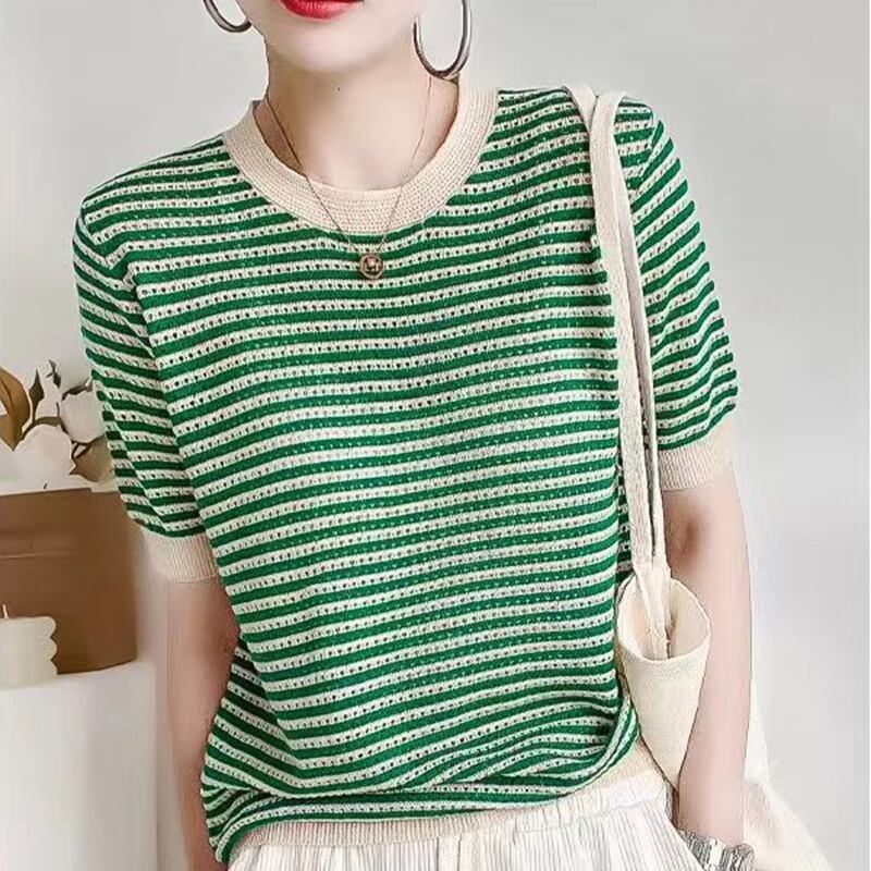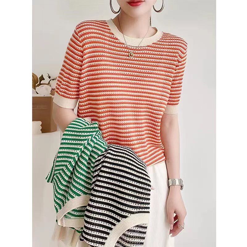 ニット Tシャツ中空アウトストライプコントラストカラーラウンドネック Tシャツプルオーバールーズシン半袖トップス夏 ショート ハーフスリーブ サマー 夏物 Oネック