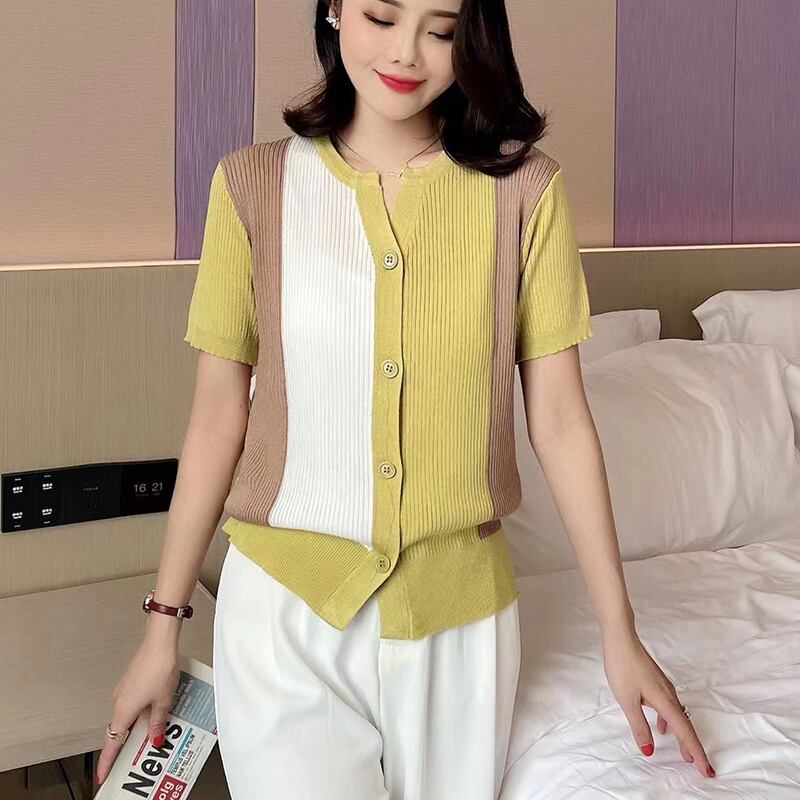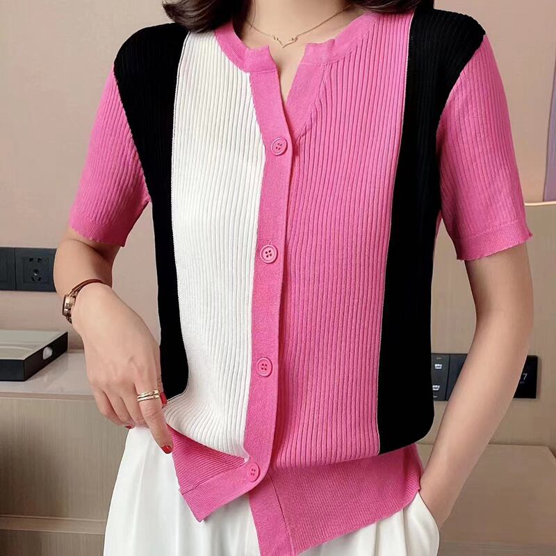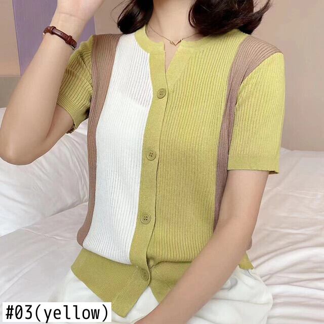 Tシャツ夏カーディガン Tシャツコントラストカラー半袖 V ネックニットトップススタイル服 ショート ハーフスリーブ サマー 夏物 Vネック