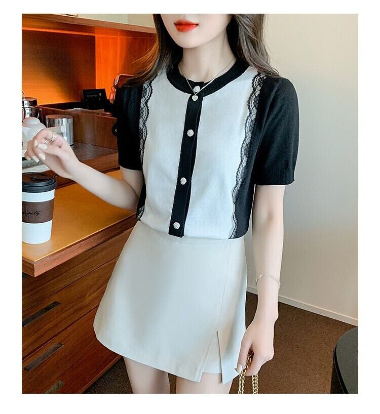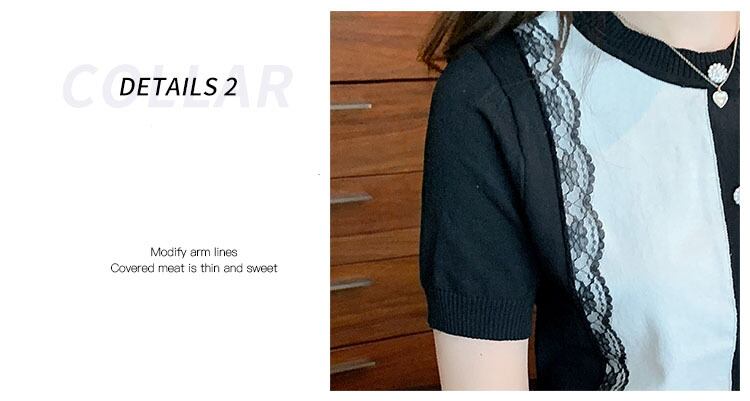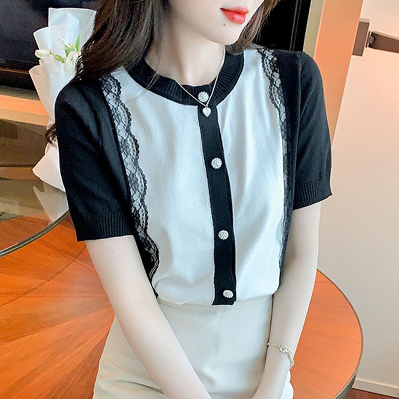 スタイル Tシャツレースパッチワークニット Tシャツ夏半袖 O ネック Tシャツカーディガントップ Ropa デ ショート ハーフスリーブ サマー 夏物 Oネック