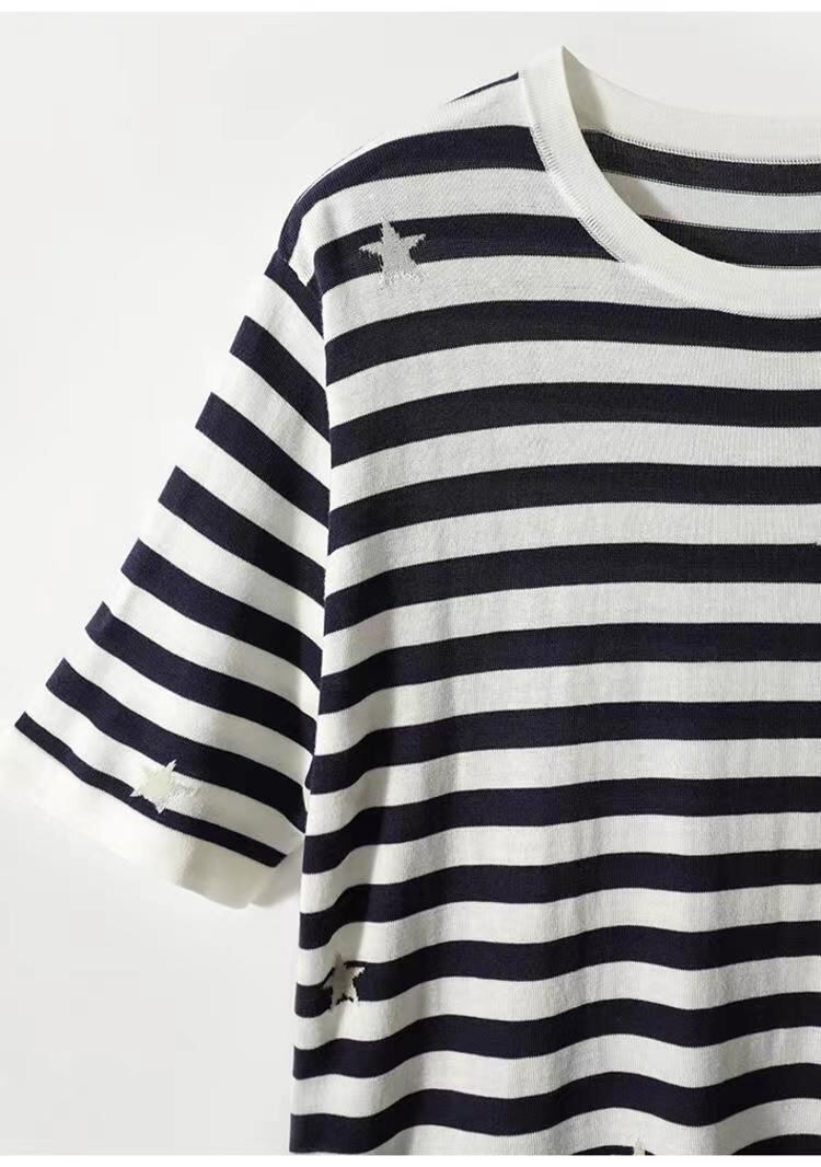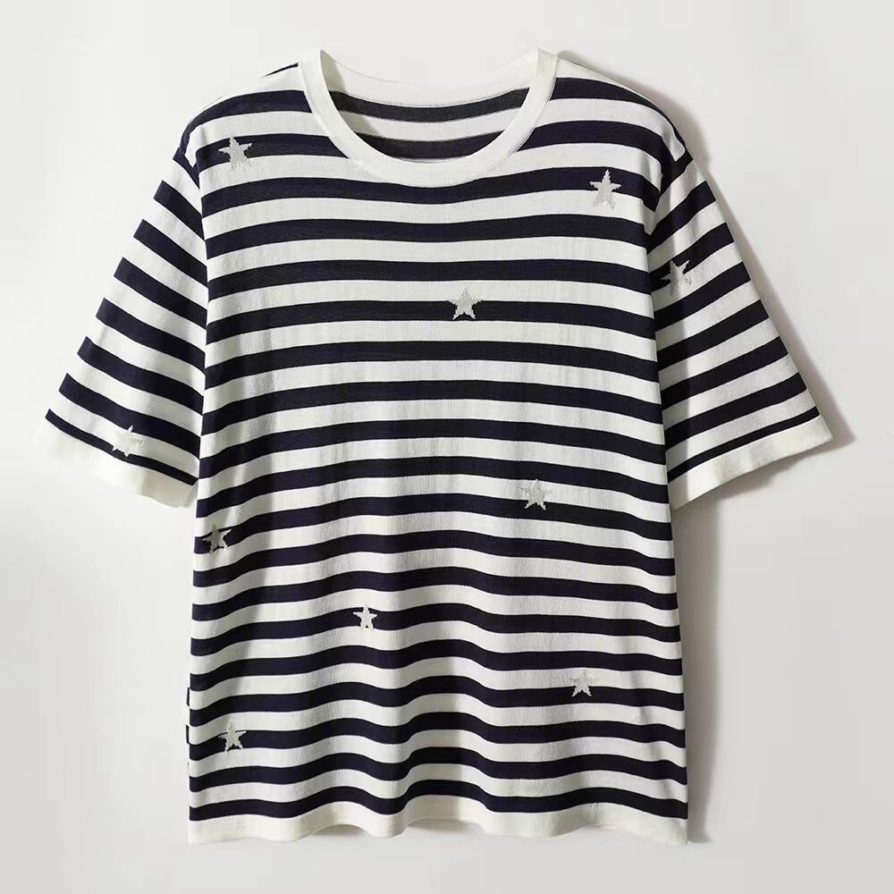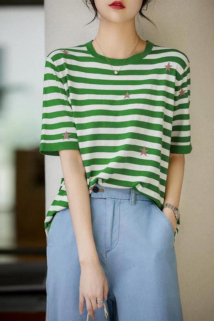 薄いストライプ夏半袖ニットトップ O ネック Tシャツ弾性 Tシャツ ショート ハーフスリーブ エラスティック 伸縮 サマー 夏物 Oネック