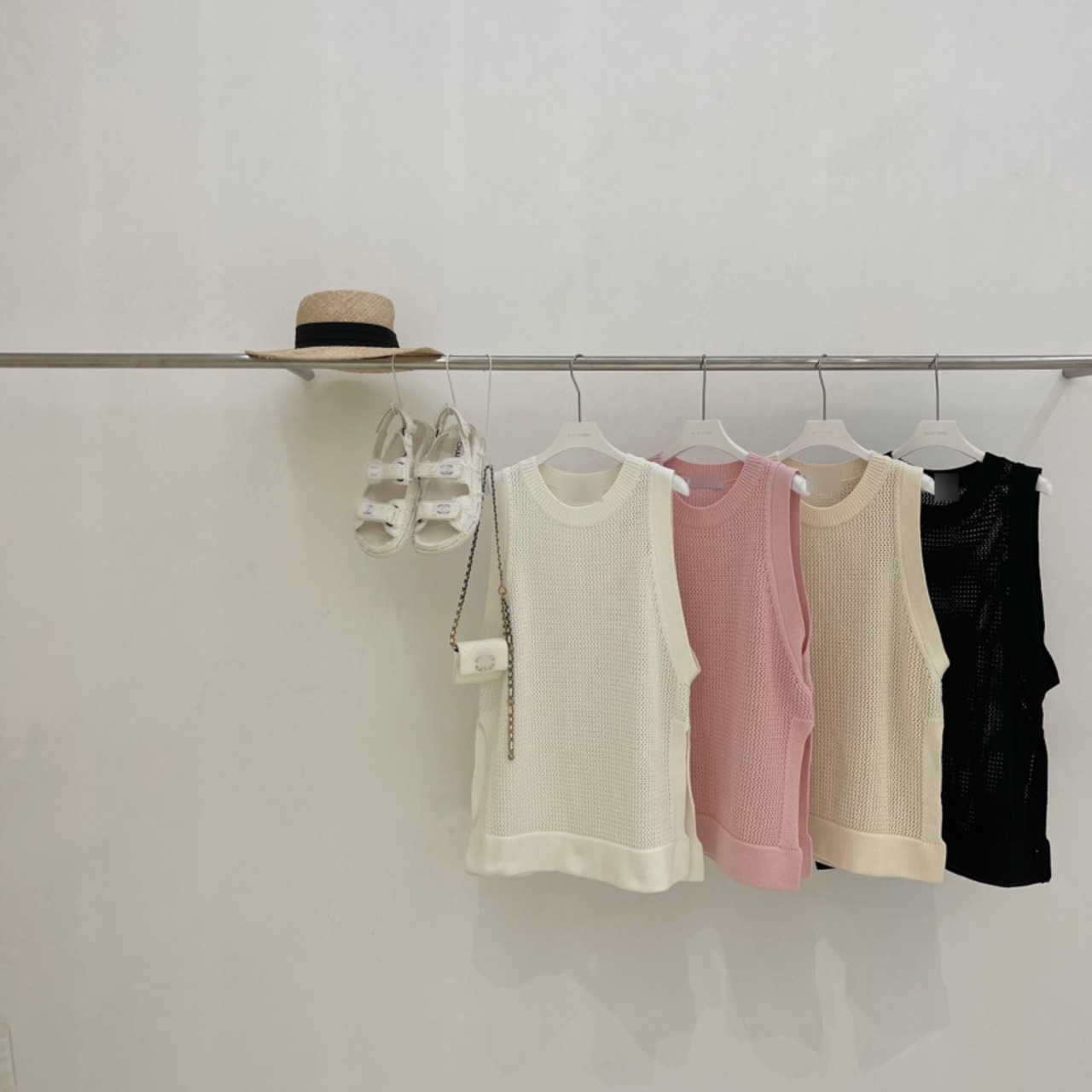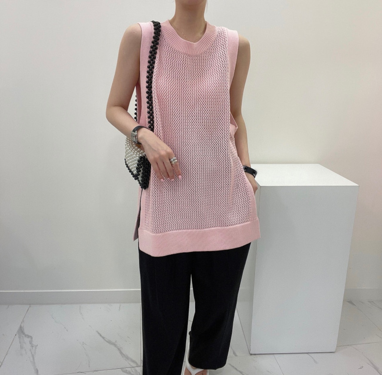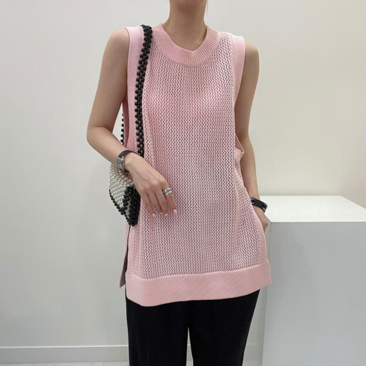 夏中空アウトニットベスト服ピンク O ネックルーズノースリーブ Y2K トップス黒 Tシャツ ブラック サマー 夏物 Oネック