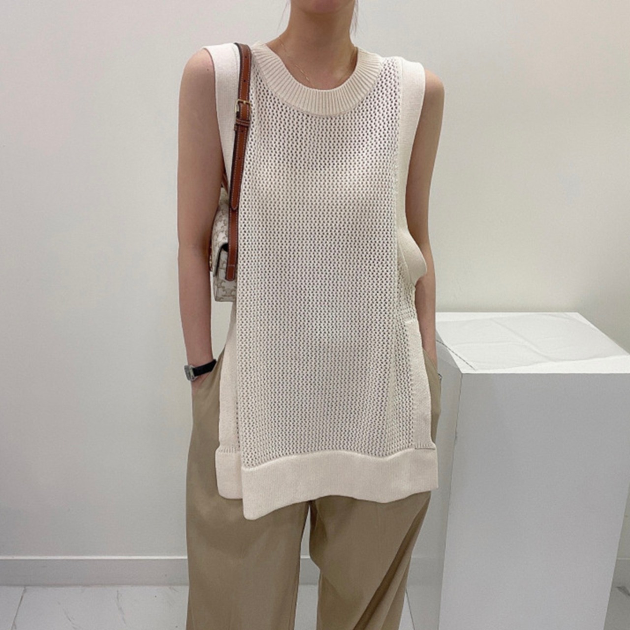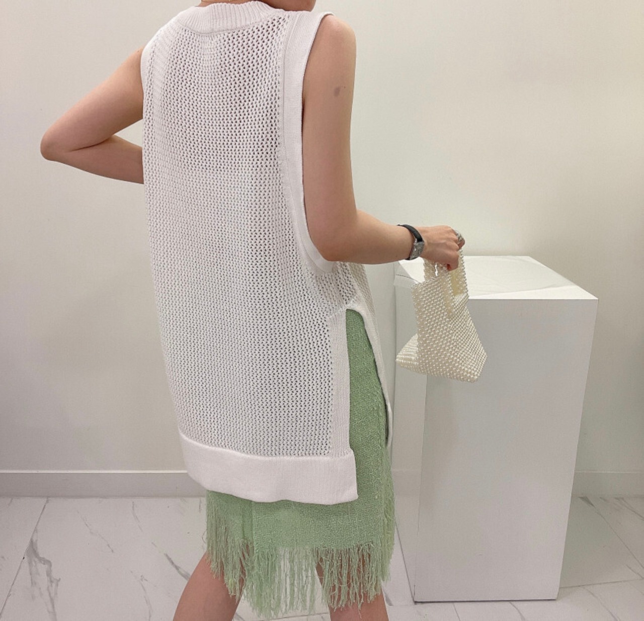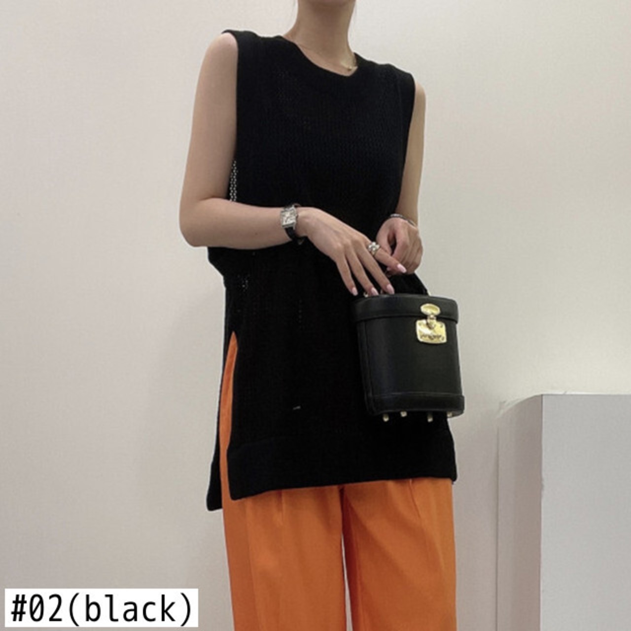 夏中空アウトニットベスト服ピンク O ネックルーズノースリーブ Y2K トップス黒 Tシャツ ブラック サマー 夏物 Oネック