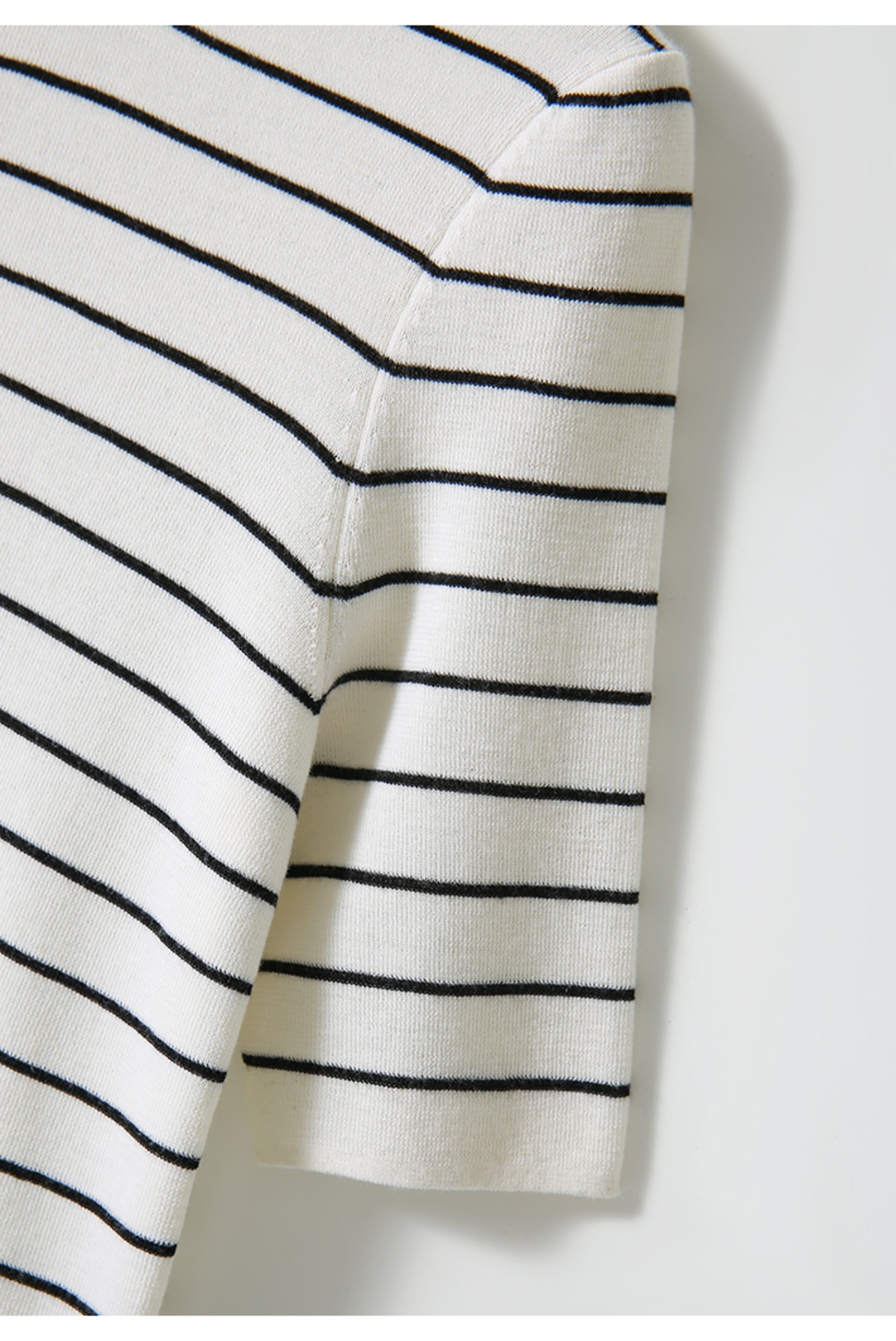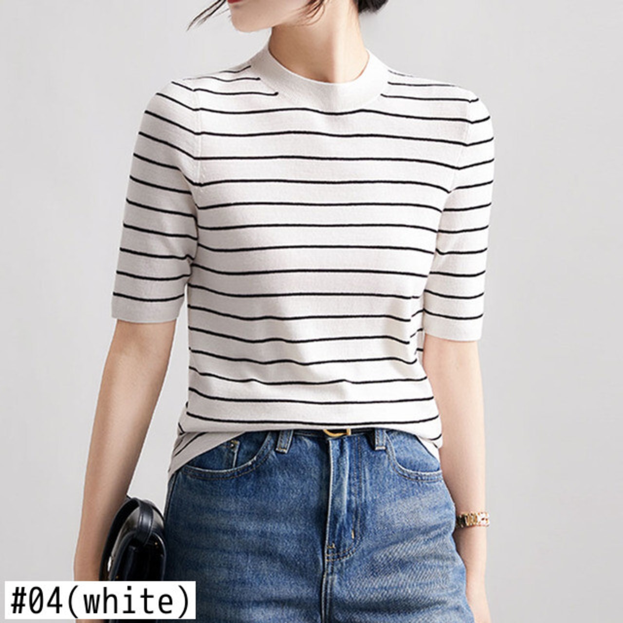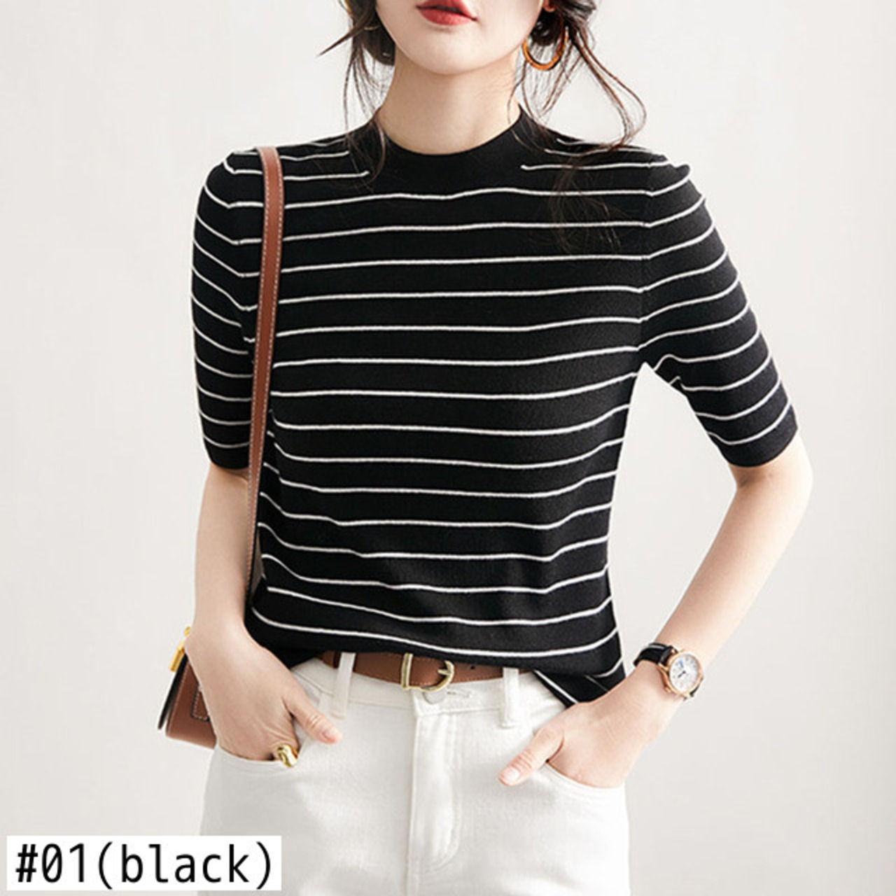 服ストライプ半袖プルオーバーニットトップススリムソフトセーター春夏 ショート ハーフスリーブ スプリング 春物 サマー 夏物