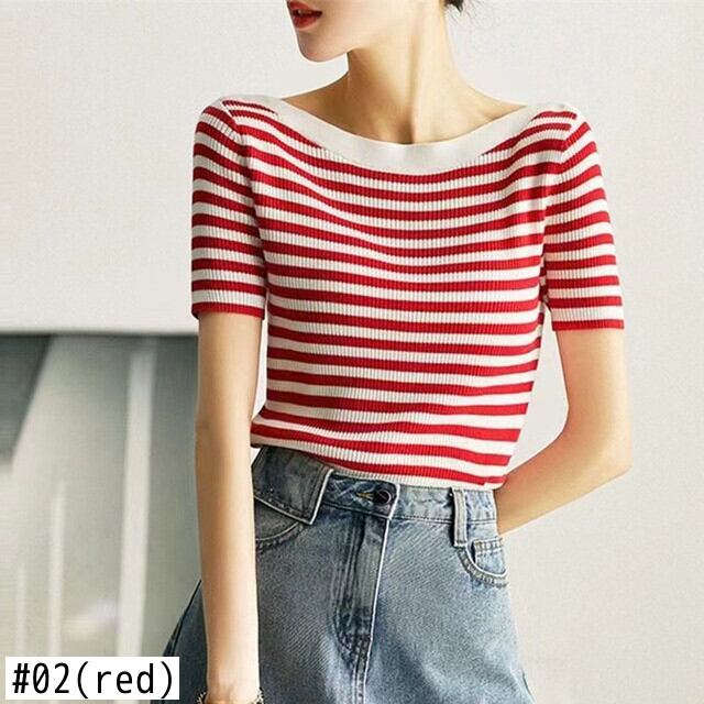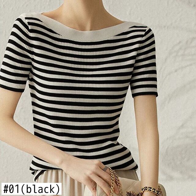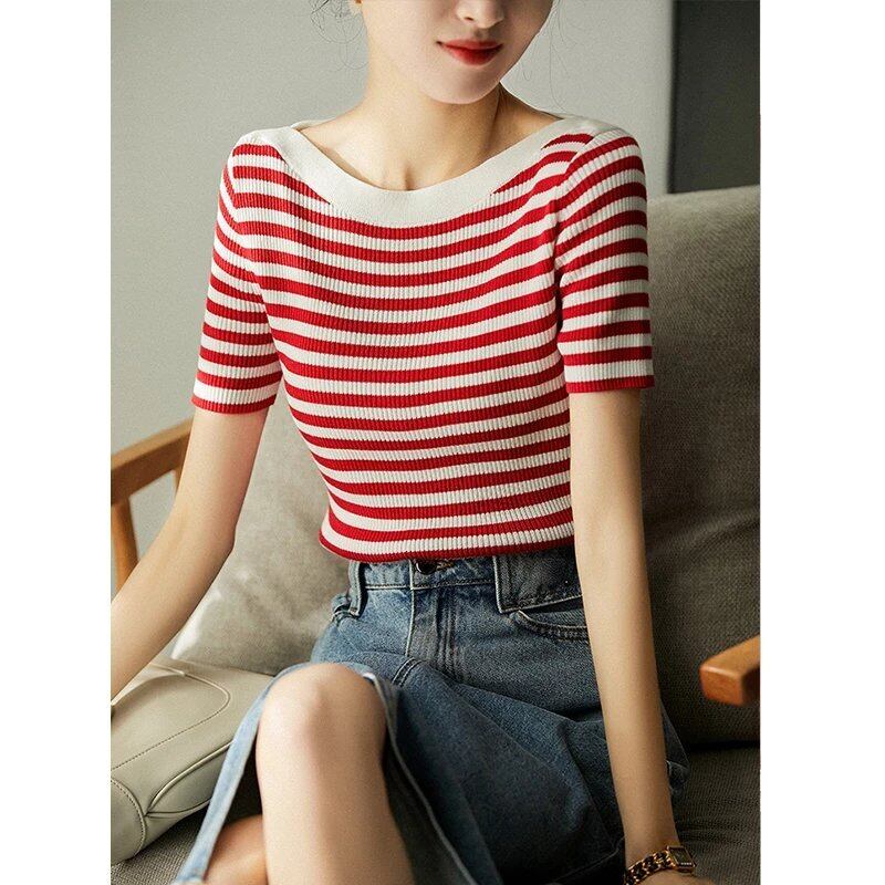 弾性スリムストライプ Tシャツ夏ニットトップススラッシュネック Tシャツ半袖 Tシャツ ショート ハーフスリーブ エラスティック 伸縮 サマー 夏物