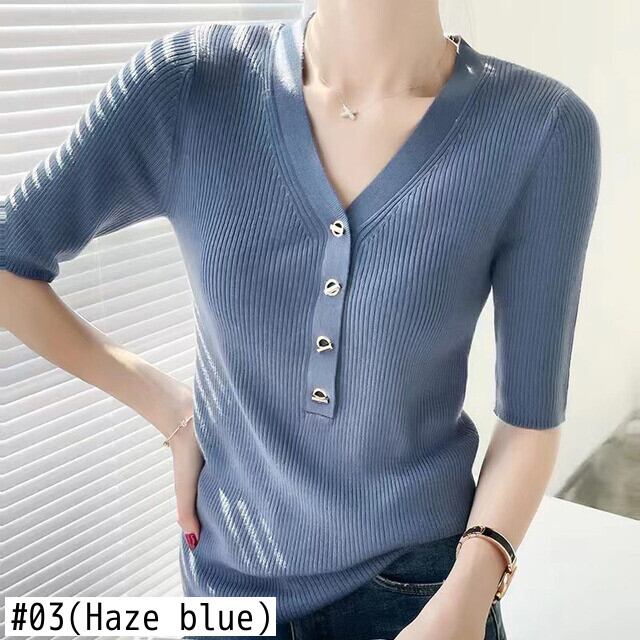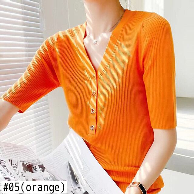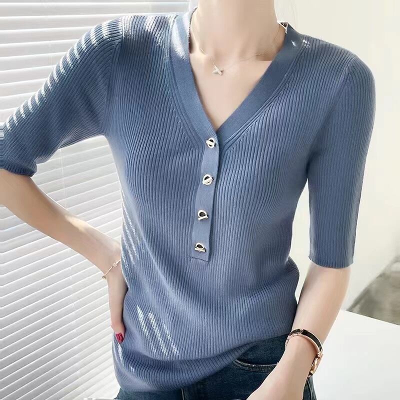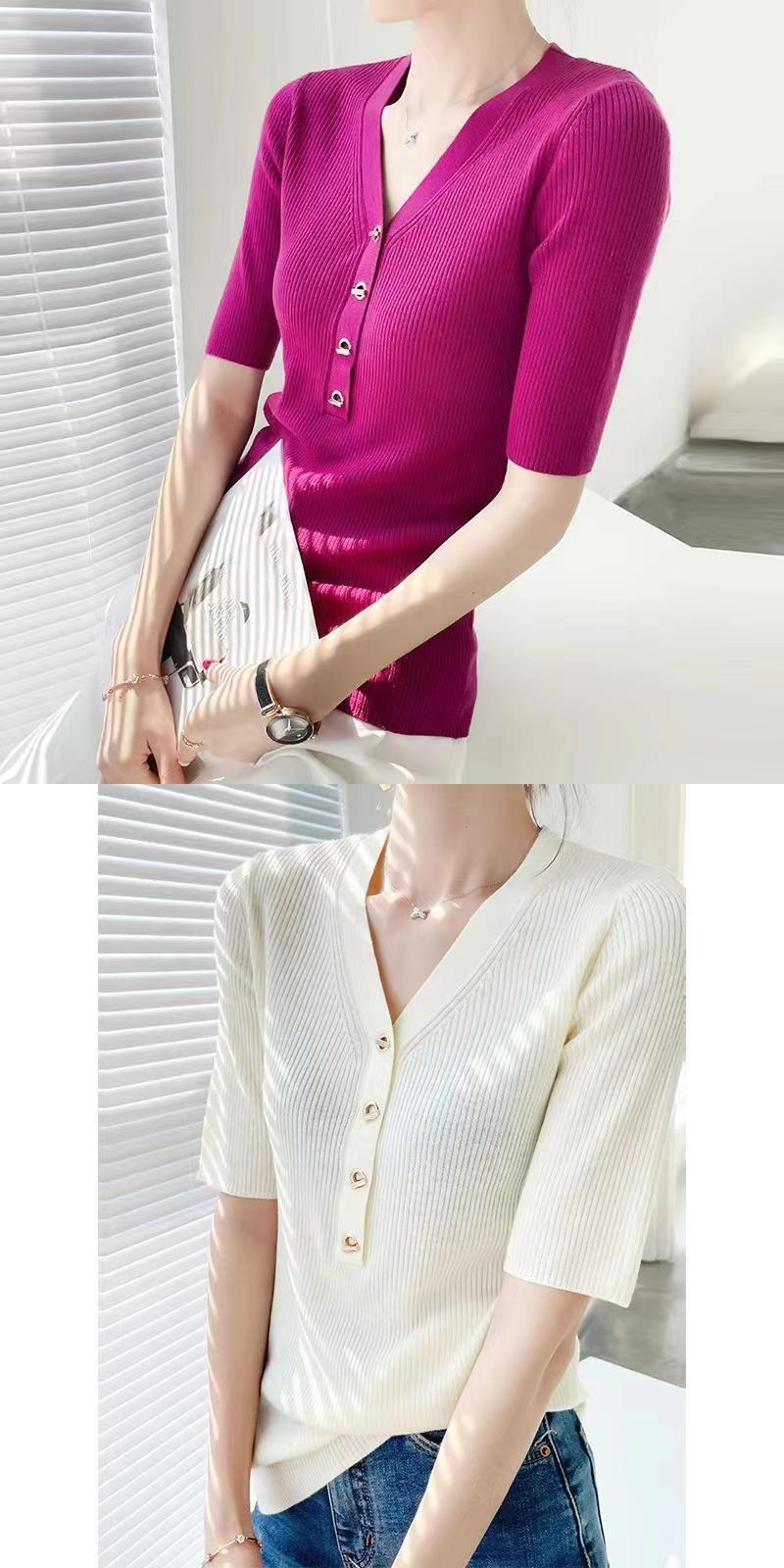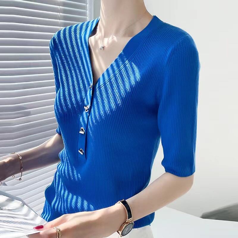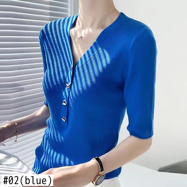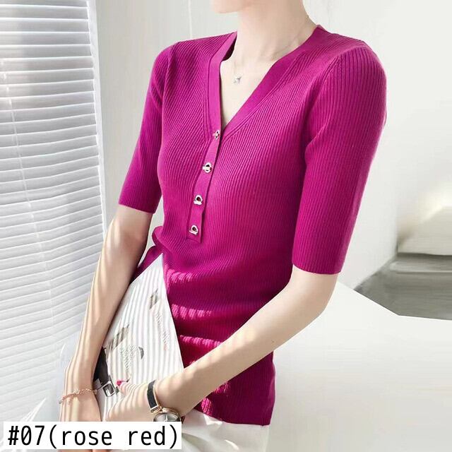 夏 V ネックメタルバックルニット Tシャツソリッドスリム半袖ピットストリッププルオーバー Tシャツトップス ショート ハーフスリーブ サマー 夏物 Vネック ソリッドカラー