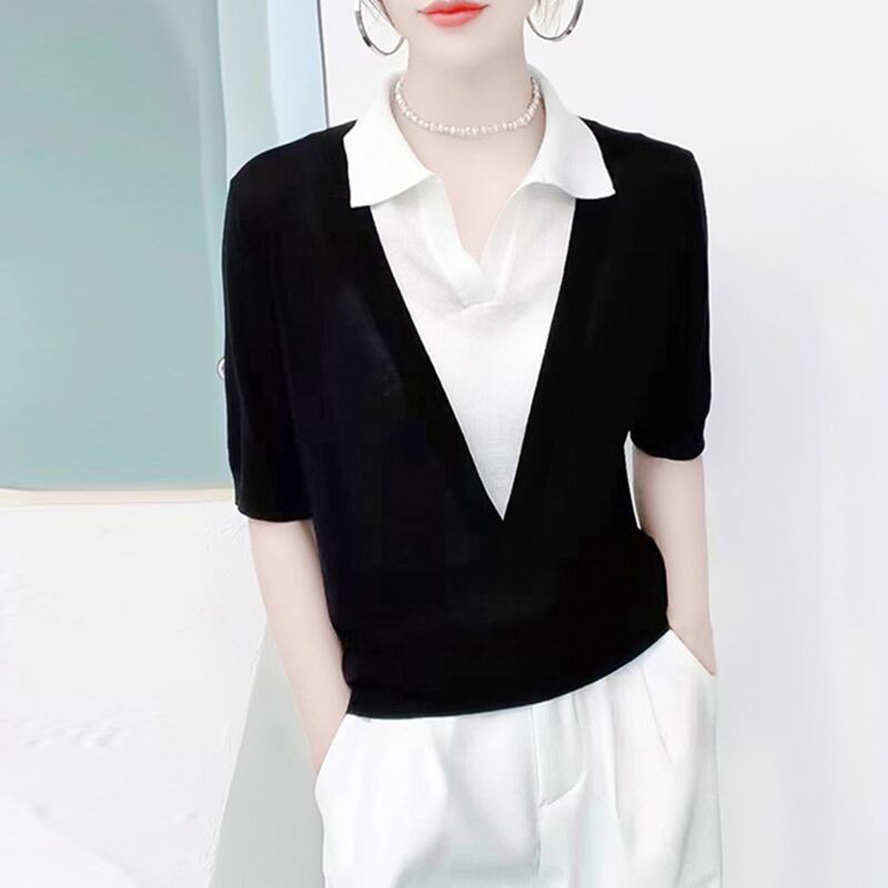 偽二枚半袖トップスプルオーバーアイス Tシャツ夏ターンダウン襟ニット Tシャツ ショート ハーフスリーブ サマー 夏物 シルク