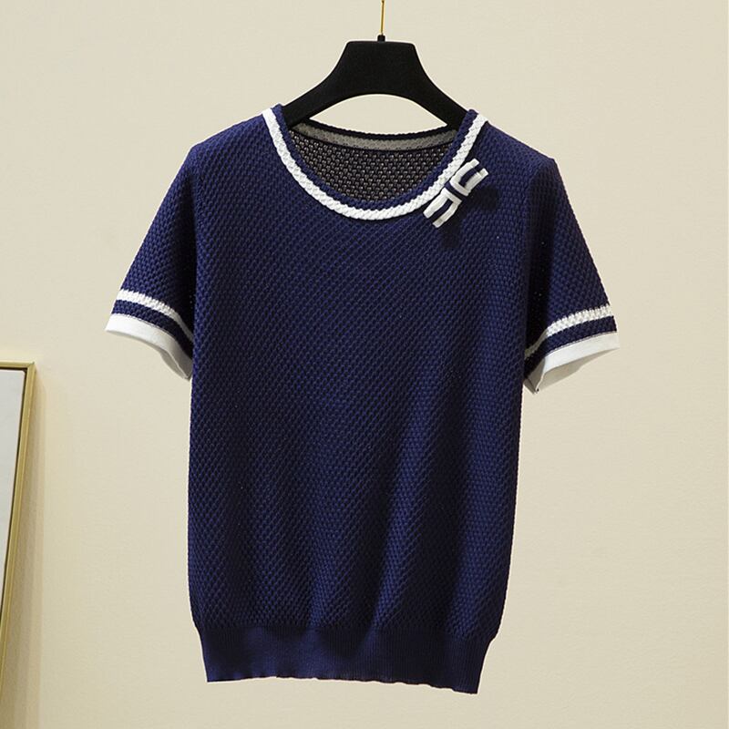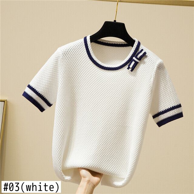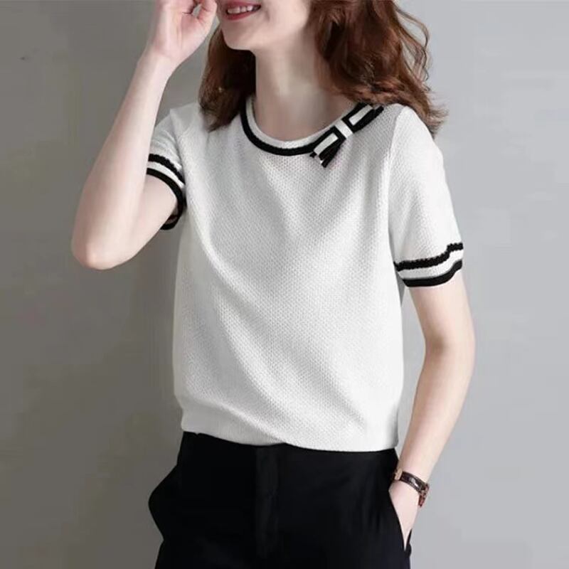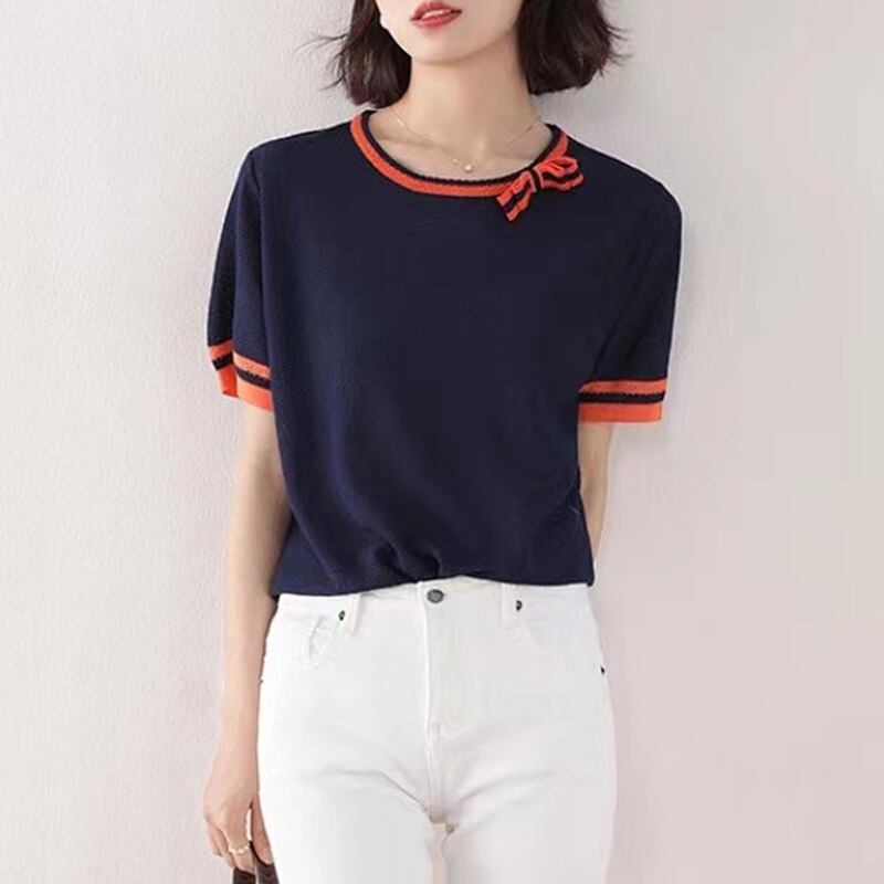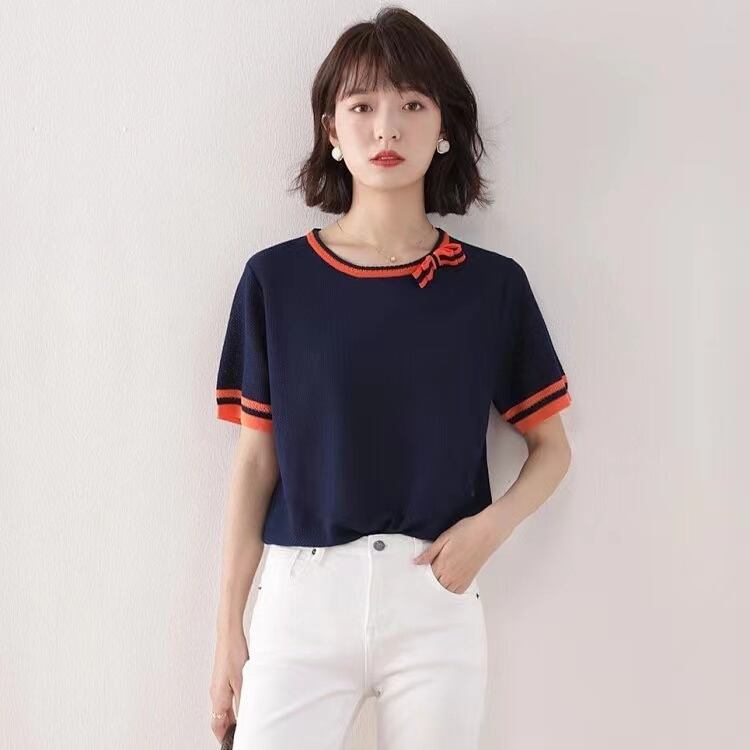 OネックTシャツパッチワーク半袖TシャツレディースサマーニットトップスボウTシャツ ショート リボン ハーフスリーブ 夏物