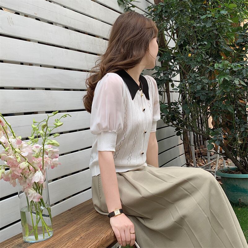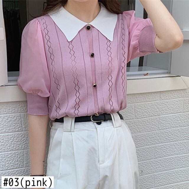 スタイル中空アウトニットトップ服夏パッチワーク半袖 Tシャツピンク薄型 Tシャツファム ショート ハーフスリーブ サマー 夏物