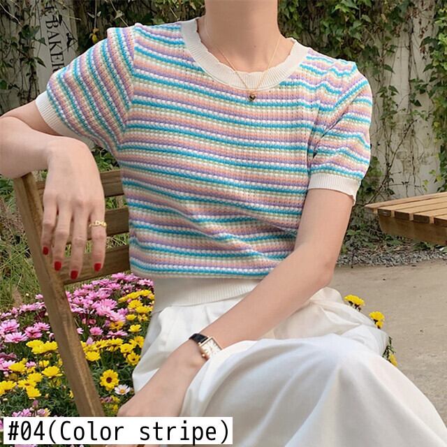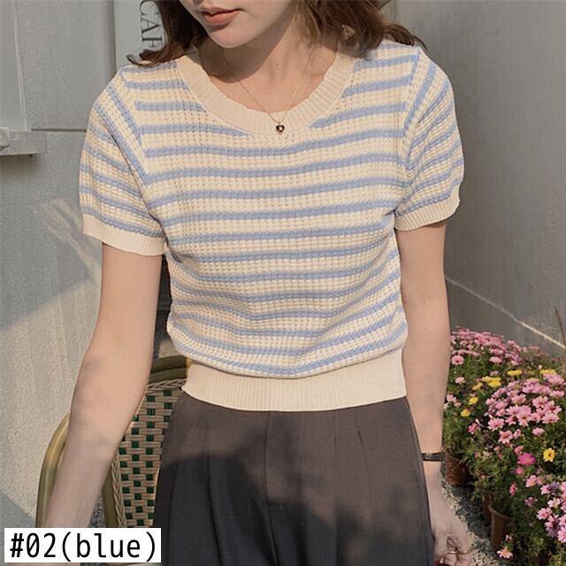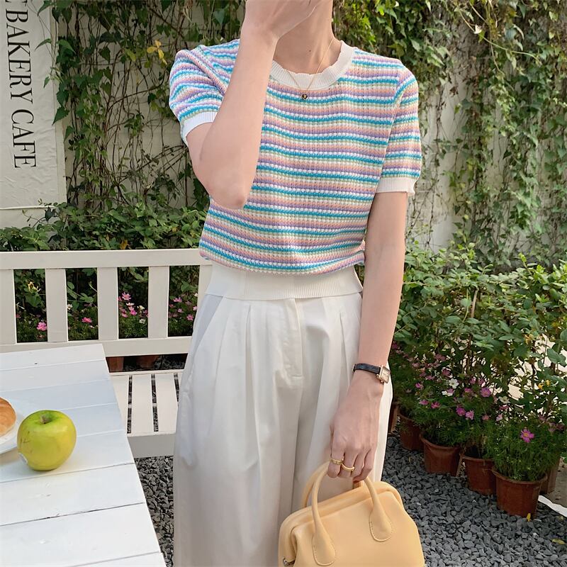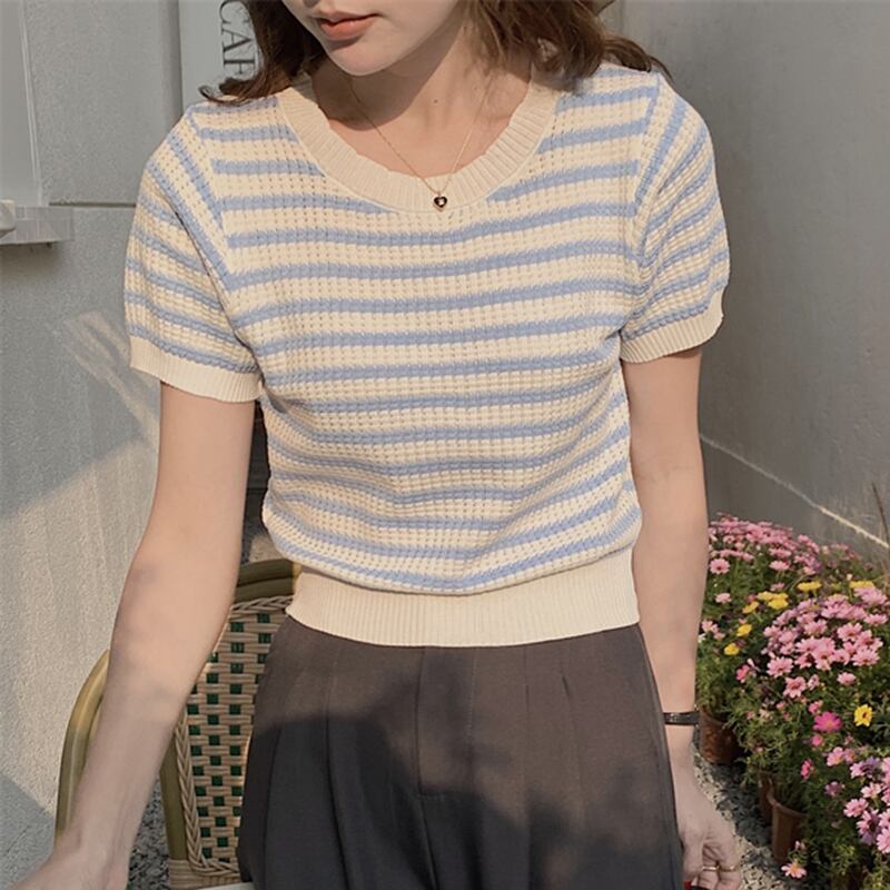 夏ストライプ半袖 Tシャツ薄い Tシャツ O ネックニットクロップトップレディース ショート ハーフスリーブ サマー 夏物 Oネック