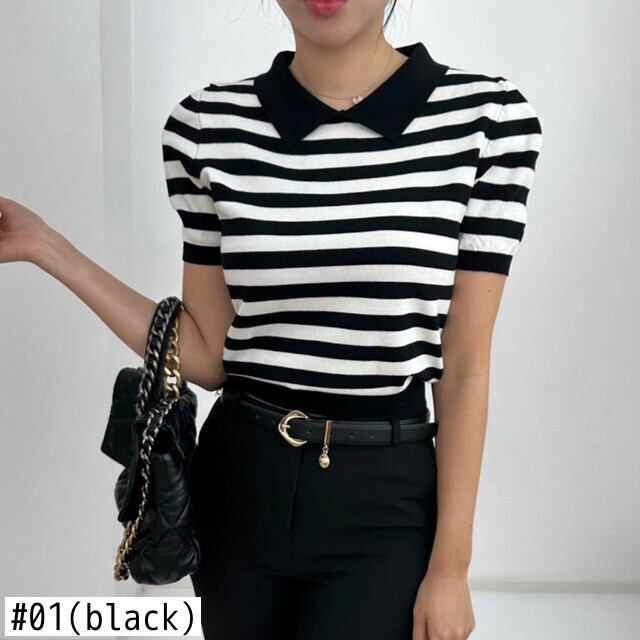 セーターデ夏半袖アイスプルオーバーニットトップスストライプターンダウン襟セーター ショート ハーフスリーブ サマー 夏物 シルク
