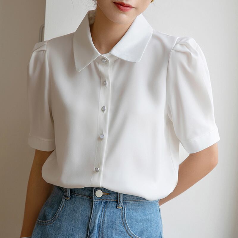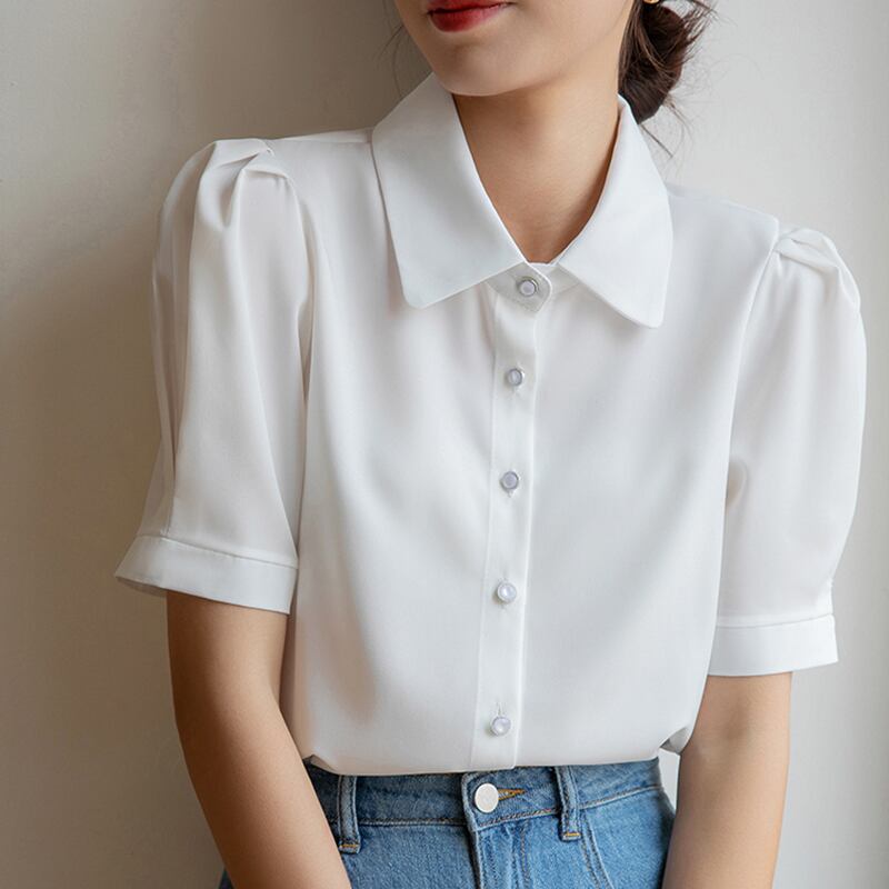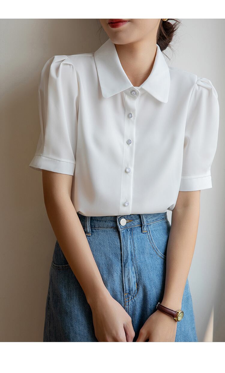 夏白いシャツ半袖ルーズ オフィス トップス シフォン ブラウス ショート ホワイト ハーフスリーブ サマー 夏物 会社 学校 通勤や通学にも
