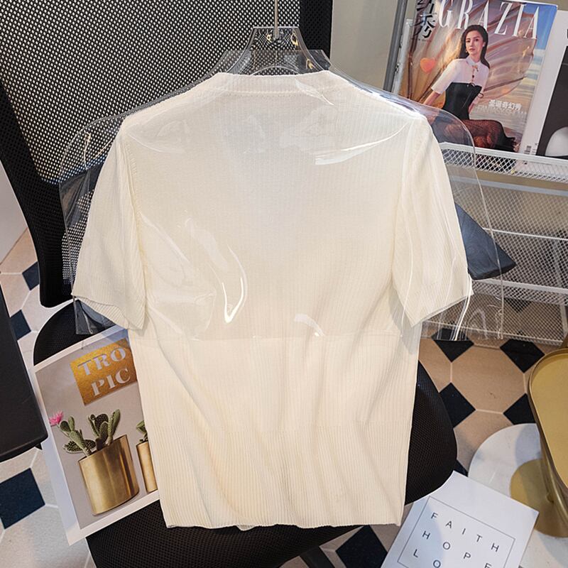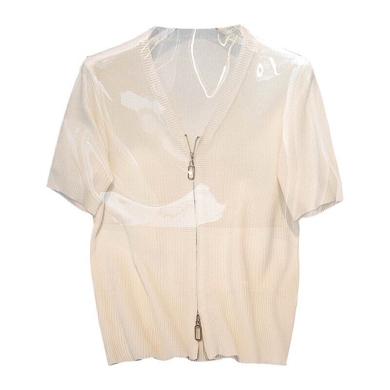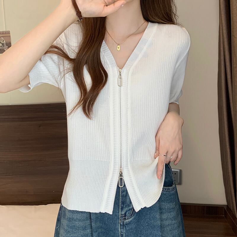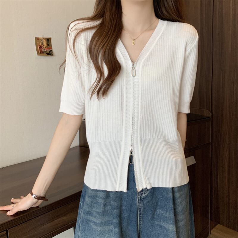 半袖ニットトップス白 V ネックジッパー薄型 Tシャツ夏黒 Tシャツカーディガン Tシャツ ショート ホワイト ブラック ハーフスリーブ サマー 夏物 Vネック