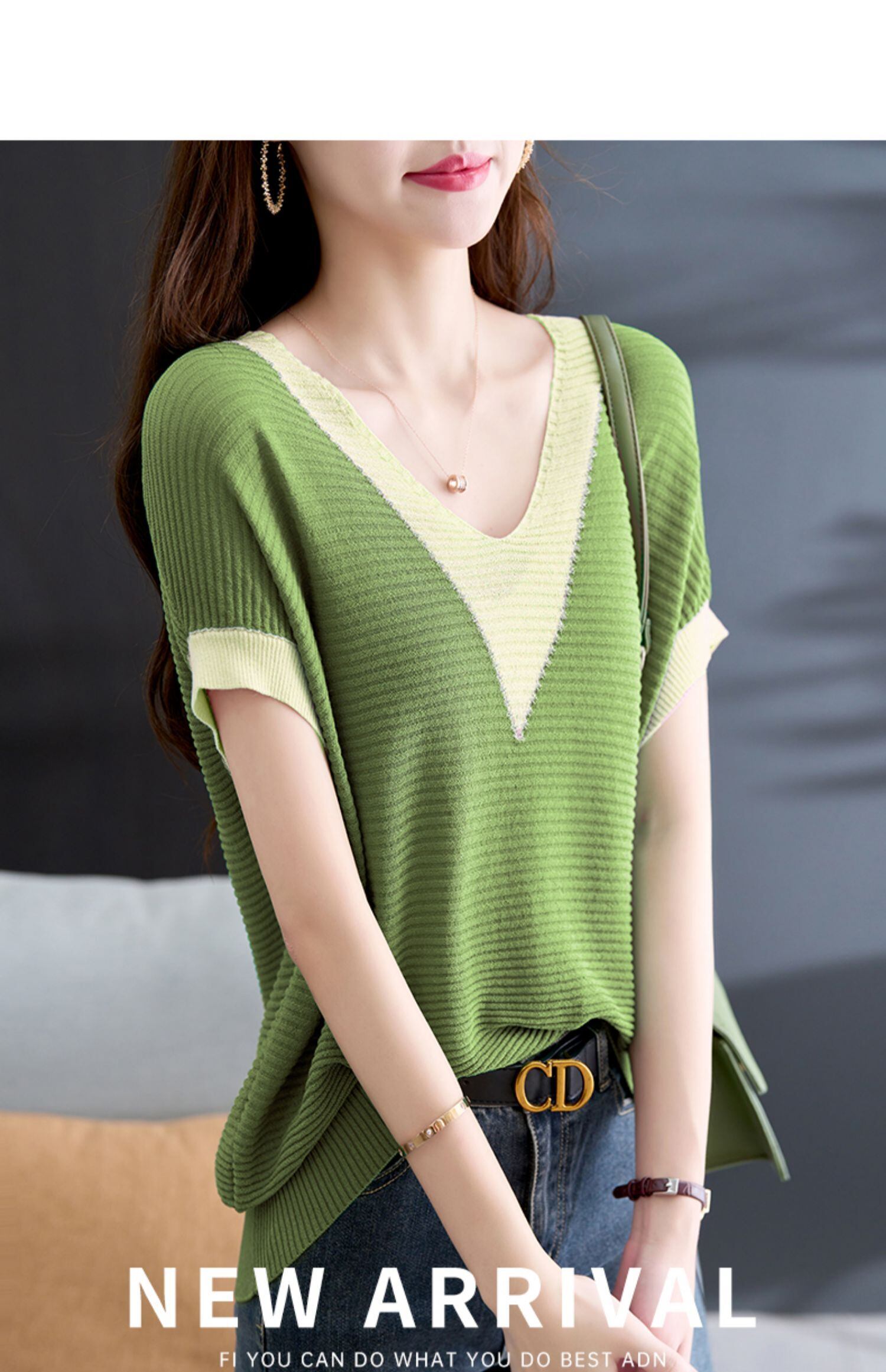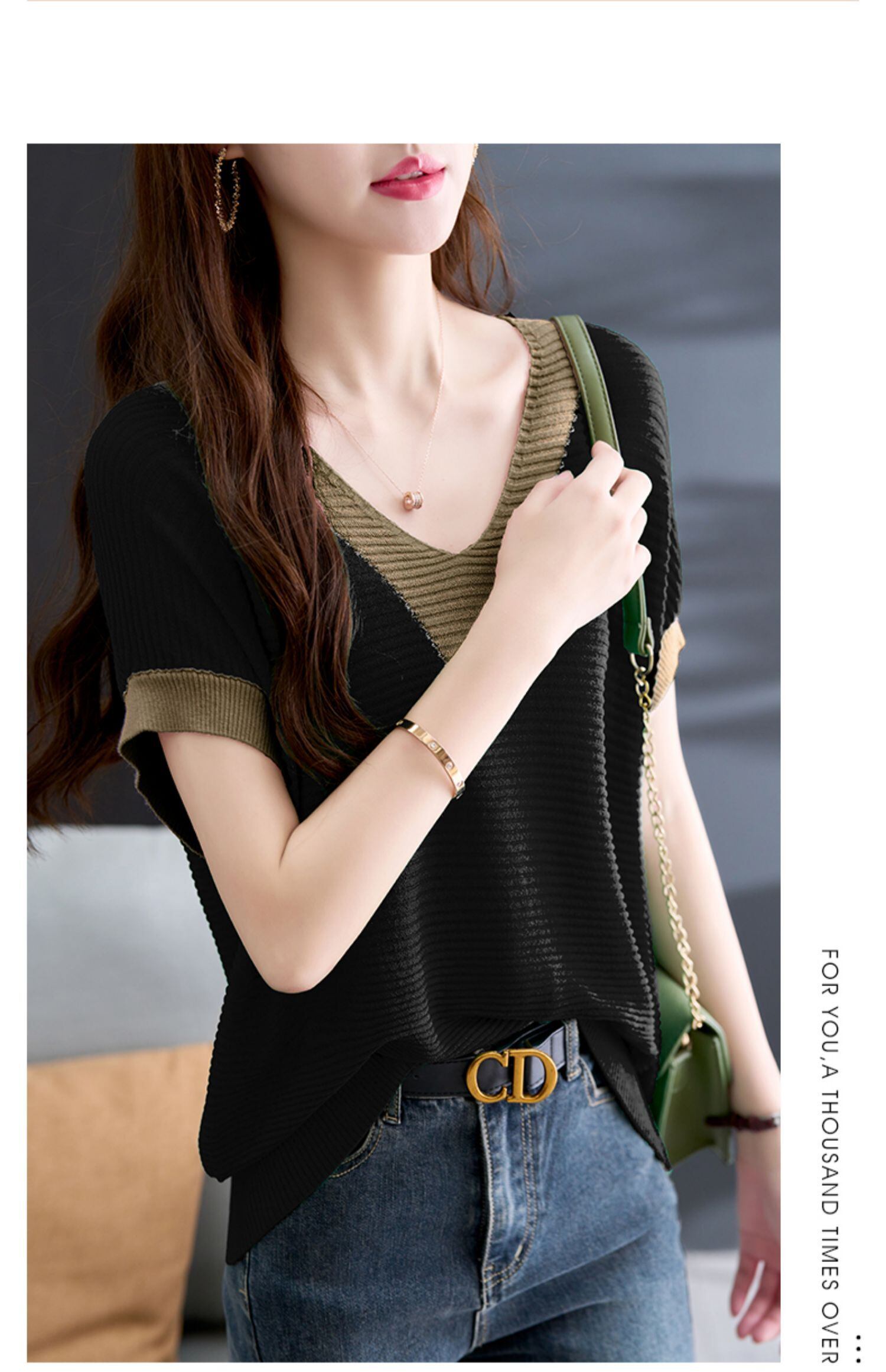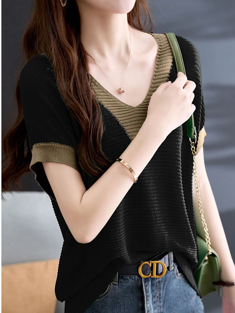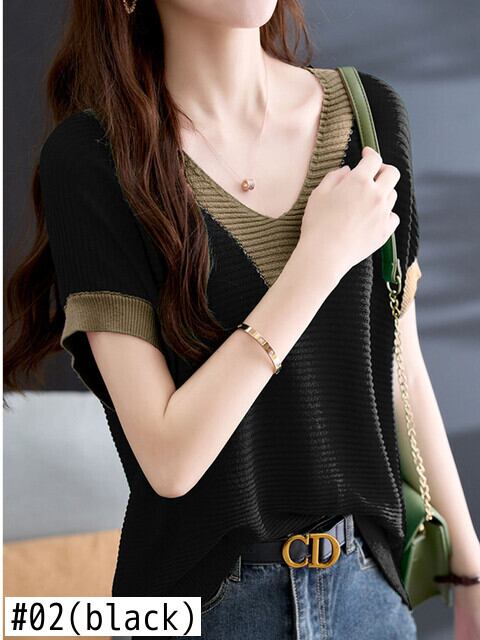 夏 V ネック半袖 Tシャツ夏コントラストカラーニットトップスルーズ Tシャツ ショート ハーフスリーブ サマー 夏物 Vネック