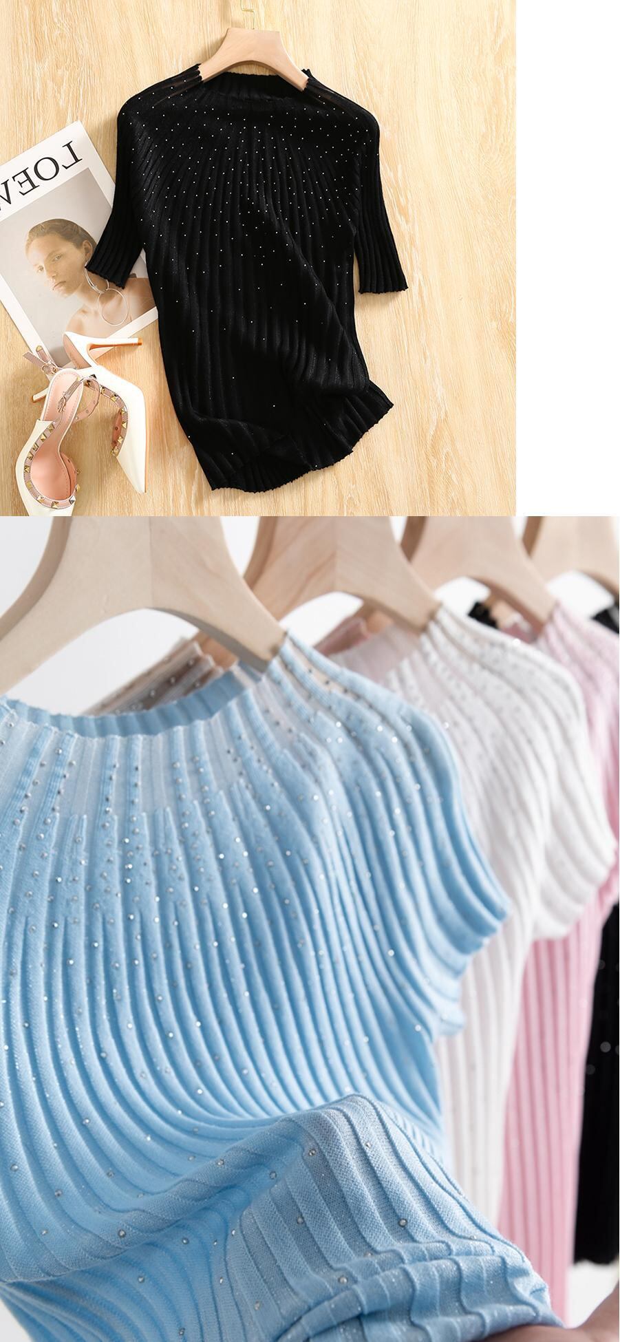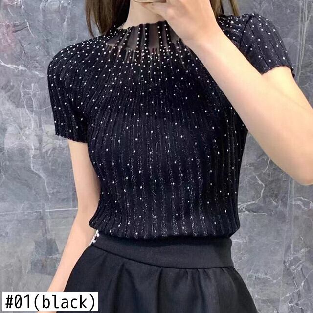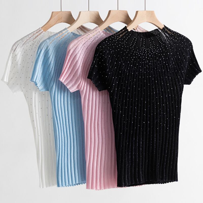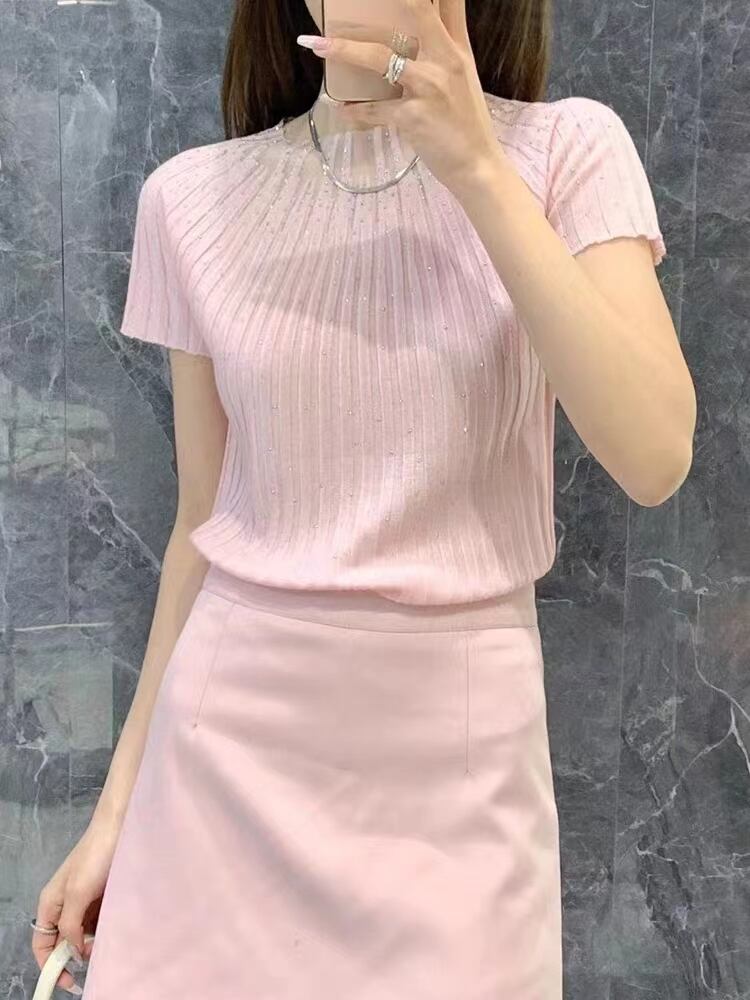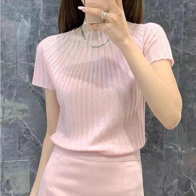 ピンクホワイトスリムニットトップスダイヤモンド半袖 Tシャツ夏 O ネック Tシャツパッチワーク Tシャツ ショート ハーフスリーブ サマー 夏物 Oネック