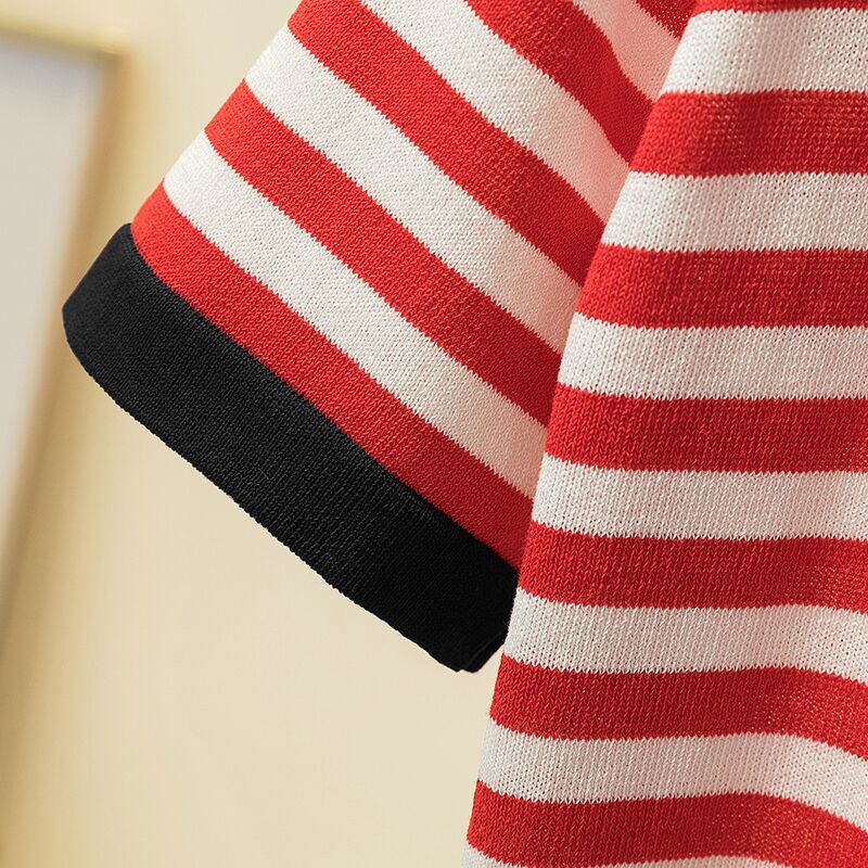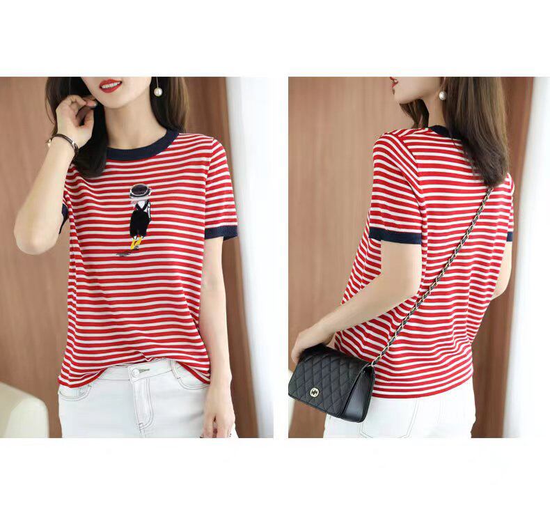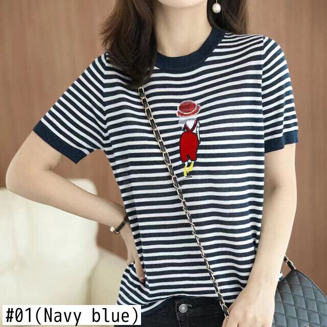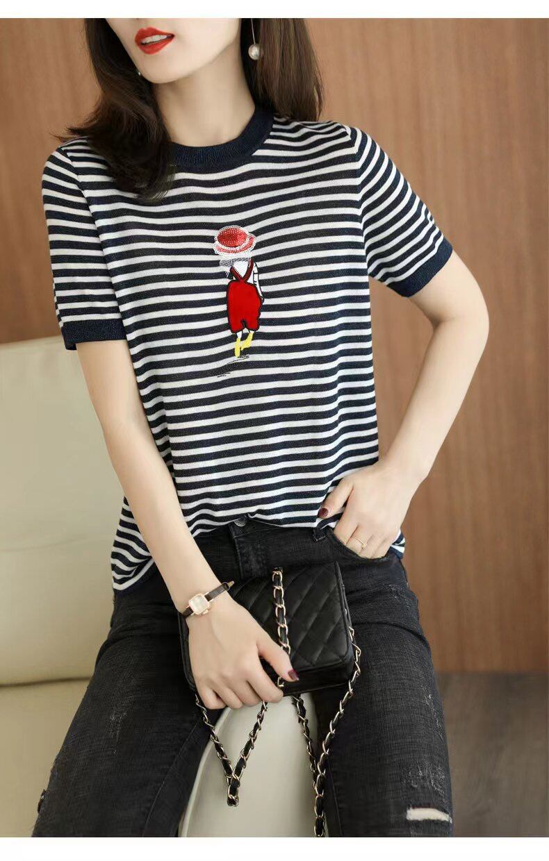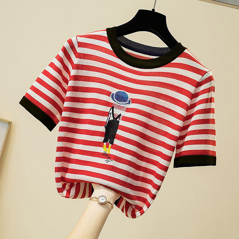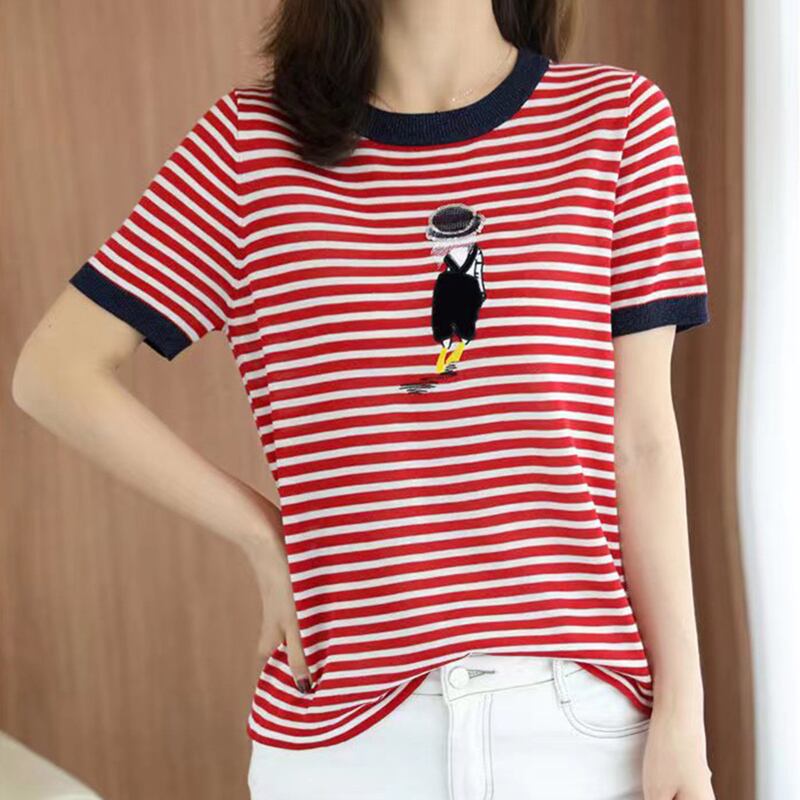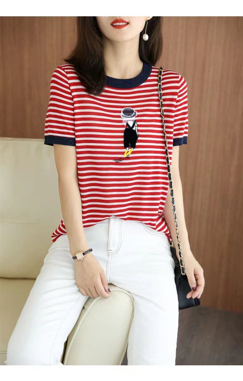 夏服刺繍トップストライプ明るい薄い Tシャツ O ネック Tシャツ半袖ニット Tシャツ ショート ハーフスリーブ サマー 夏物 Oネック シルク