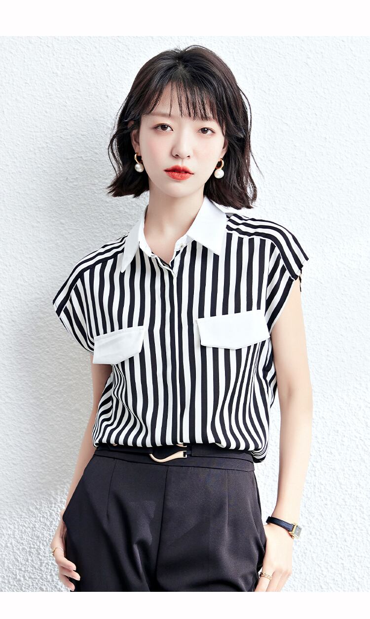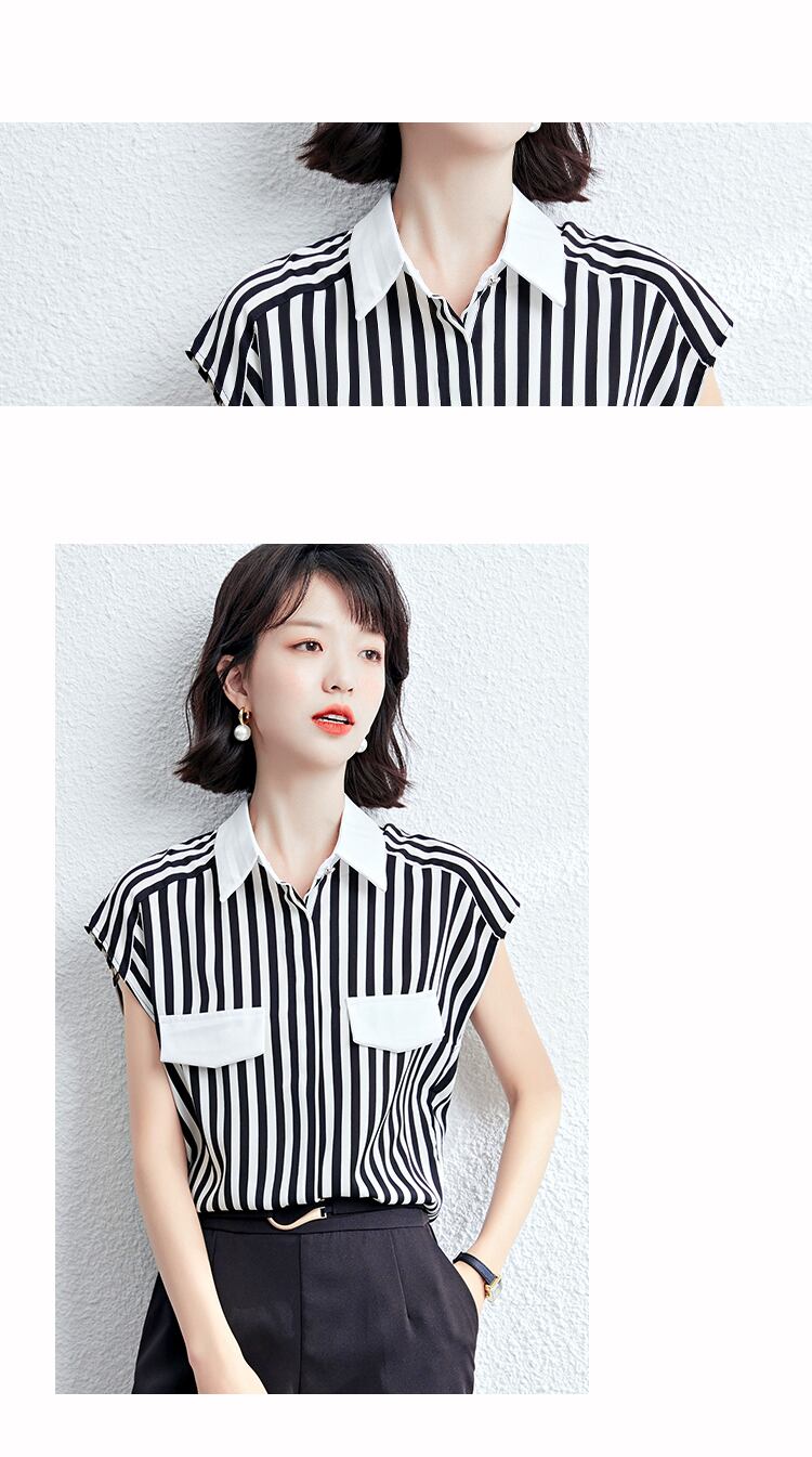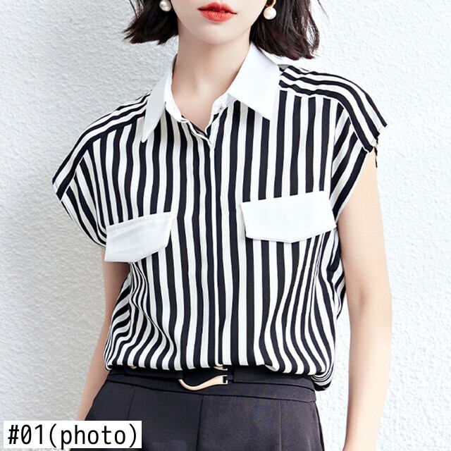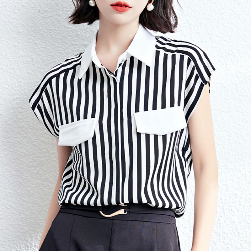 夏シフォンブラウスターンダウンカラー半袖トップスストライプオフィスシャツ ショート ハーフスリーブ サマー 夏物 会社 学校 通勤や通学にも