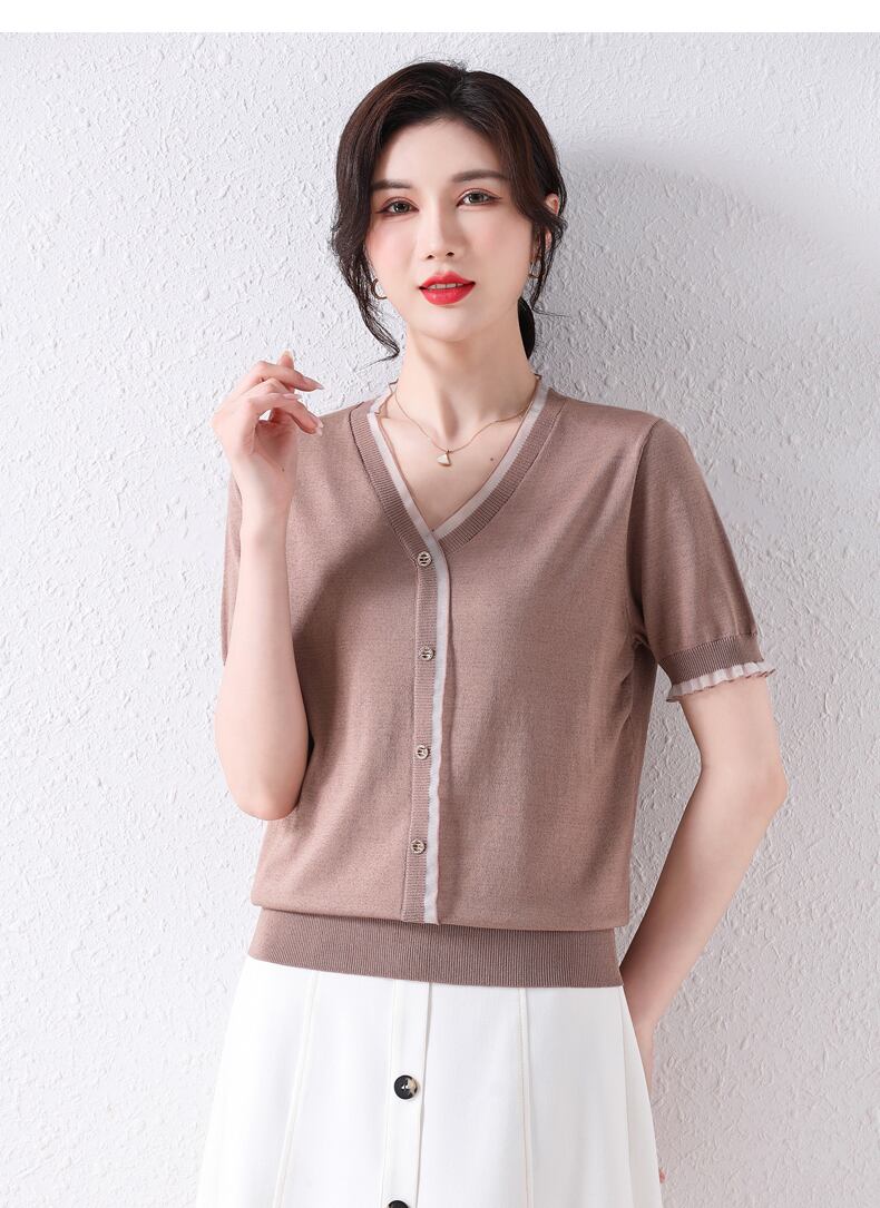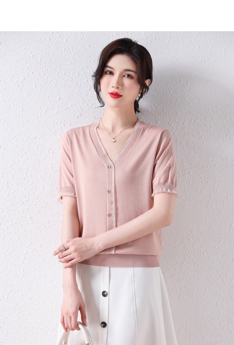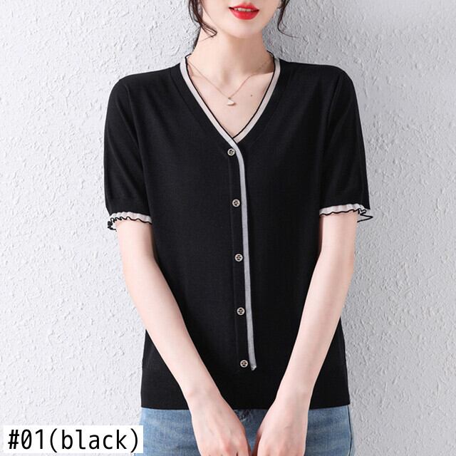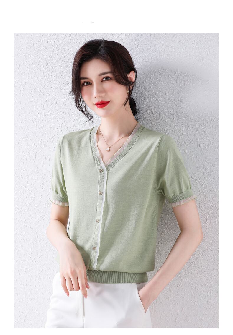 Camisetas 夏グリーンニットトップス V ネック半袖 Tシャツボタン Tシャツレディース ショート ハーフスリーブ サマー 夏物 Vネック