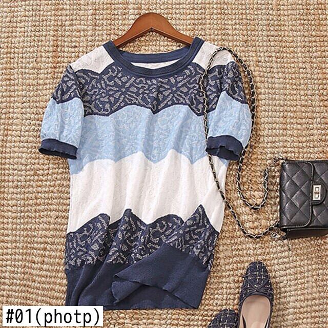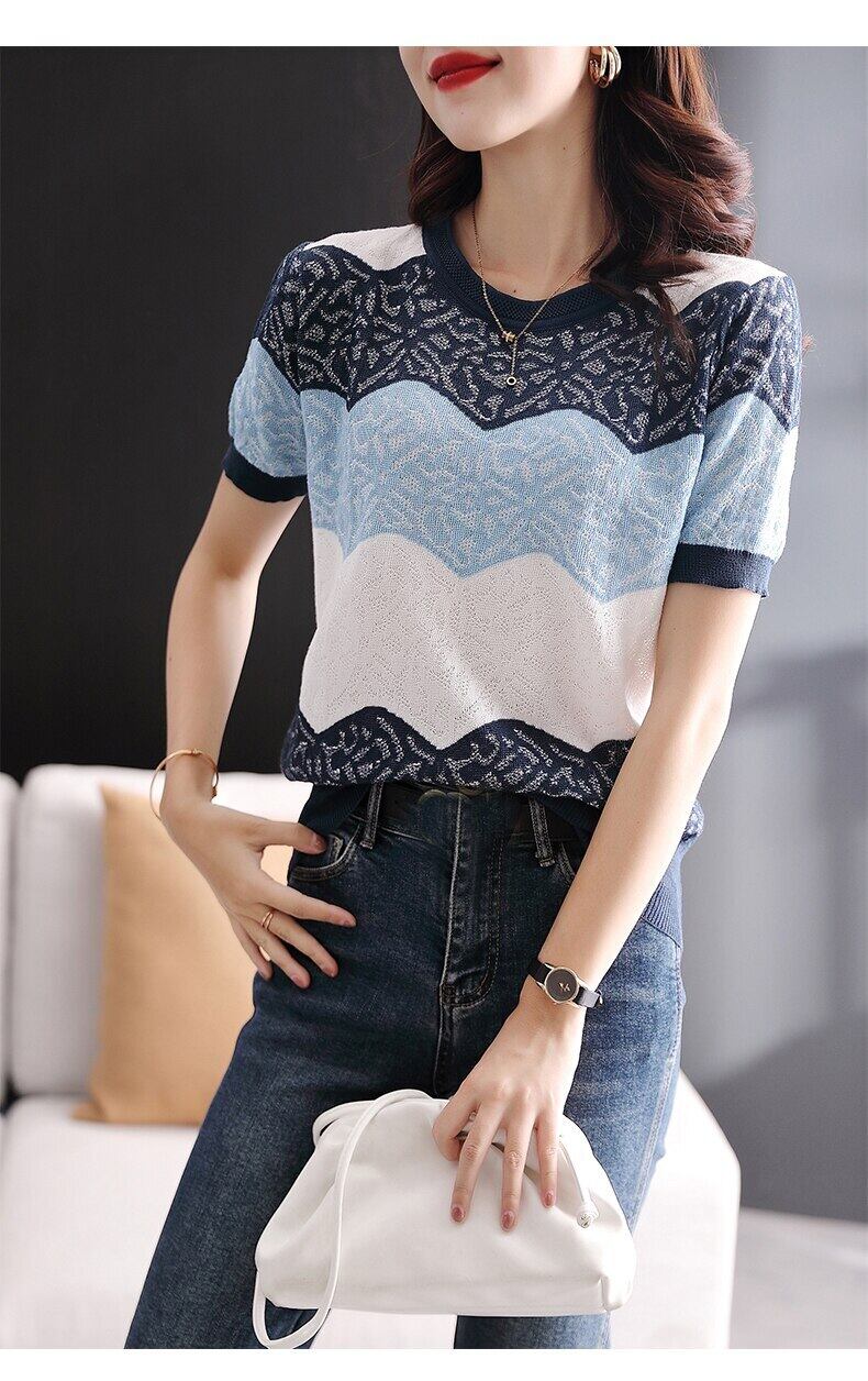 夏中空アウトニットトップストライプ薄い Tシャツ半袖 Tシャツレディース O ネック Tシャツ Camisetas デ ショート ハーフスリーブ サマー 夏物 Oネック