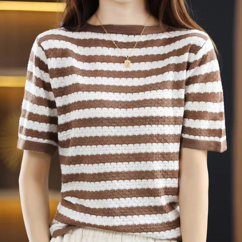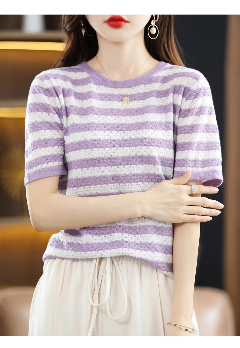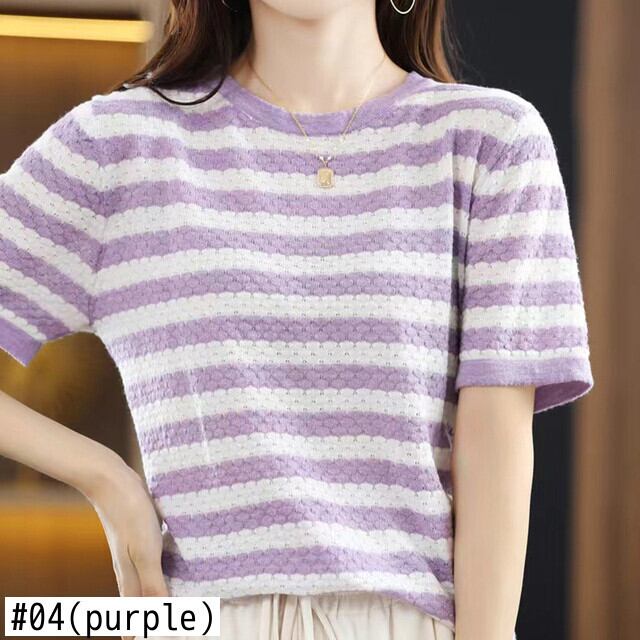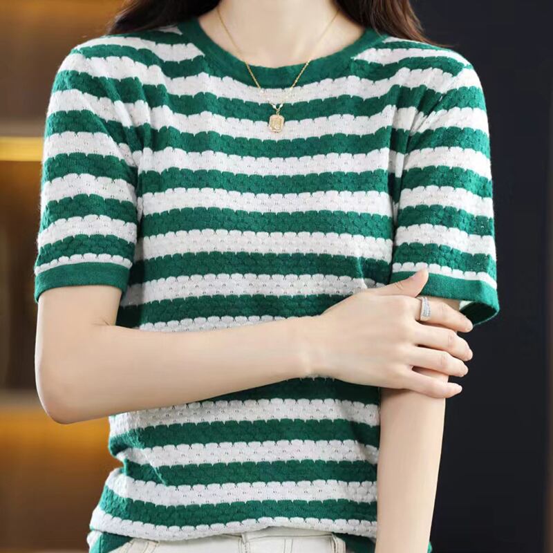 ストライプ O ネック半袖 Tシャツ夏 Ropa デ薄いルーズニットトップスプルオーバー Tシャツ Tシャツ ショート ハーフスリーブ サマー 夏物 Oネック