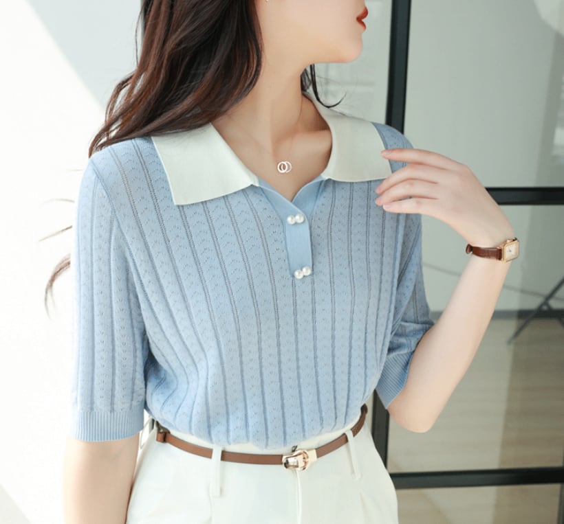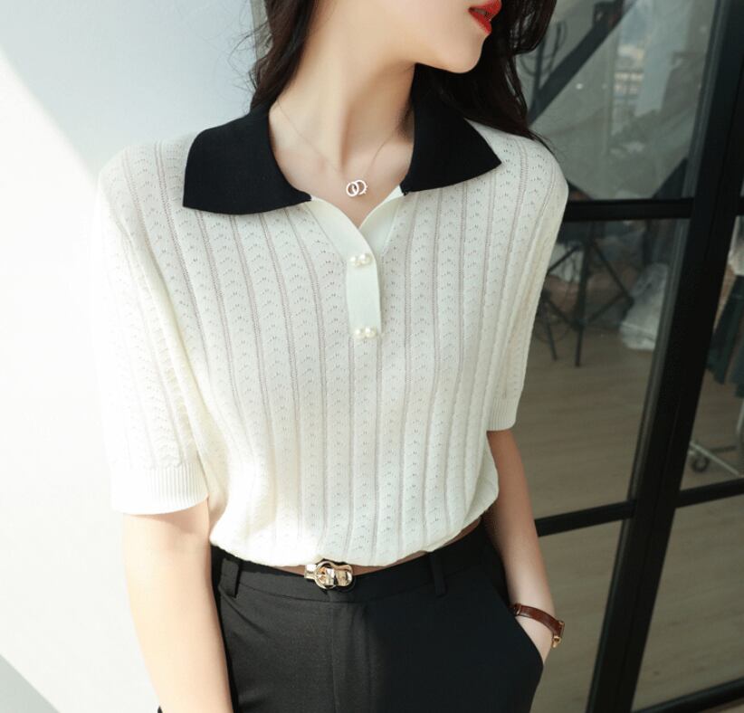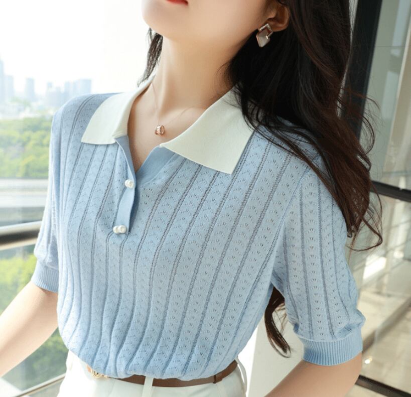 アイス服夏ターンダウン襟ニットトップス半袖 Tシャツプルオーバー Tシャツ ショート ハーフスリーブ サマー 夏物 シルク