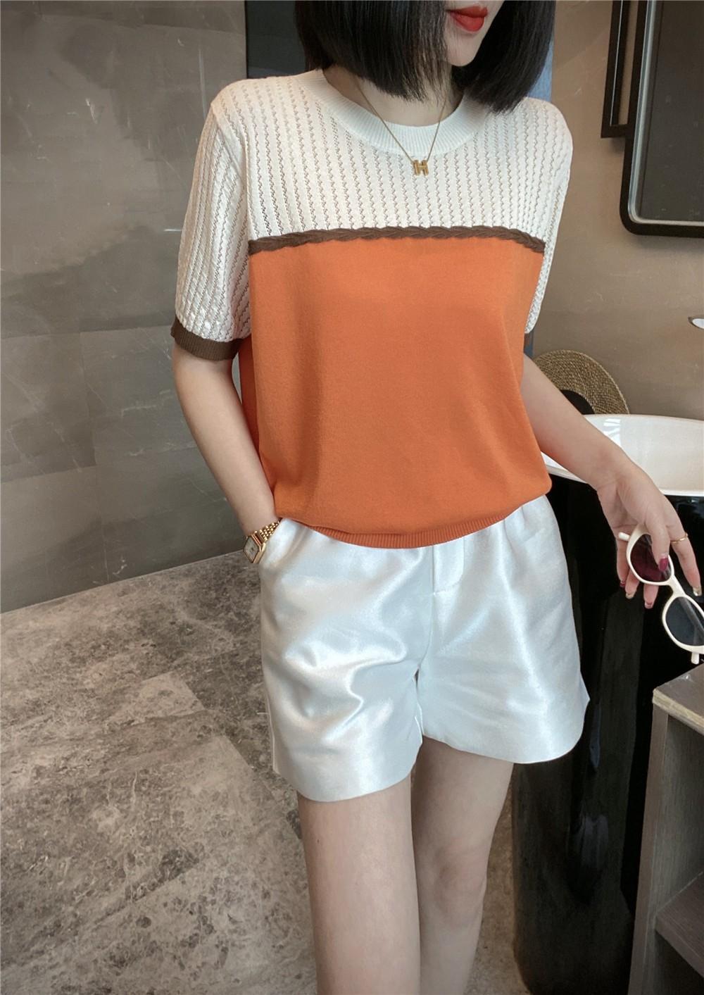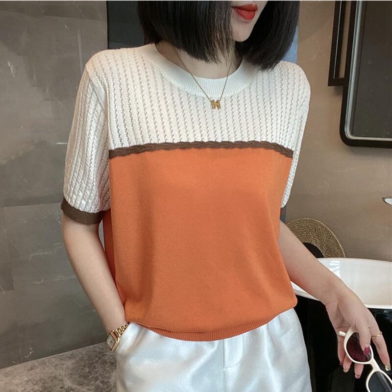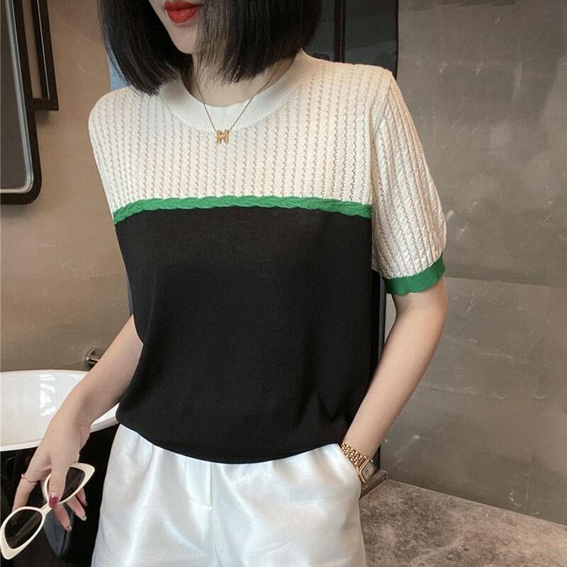 Camisetas 夏パッチワークニットトップ中空アウト薄型 Tシャツ Tシャツ半袖 Tシャツ ショート ハーフスリーブ サマー 夏物