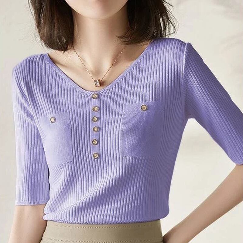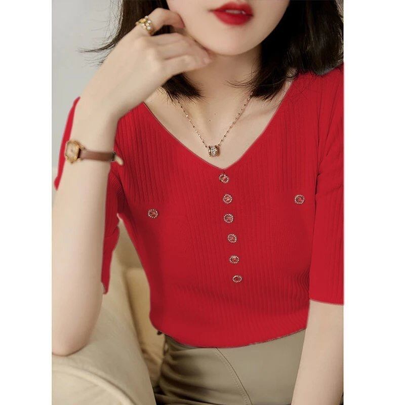 Tシャツ夏半袖 Tシャツスリム服ボタン V ネックニットトップス白 Tシャツ ショート ホワイト ハーフスリーブ サマー 夏物 Vネック