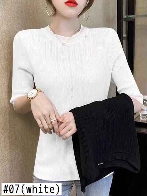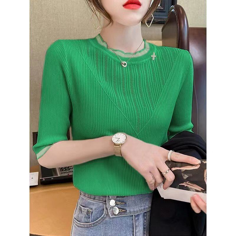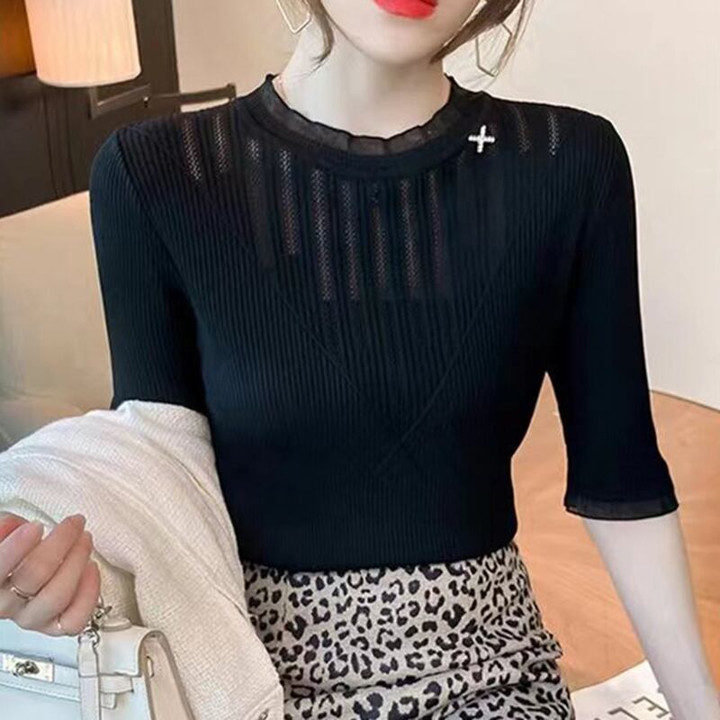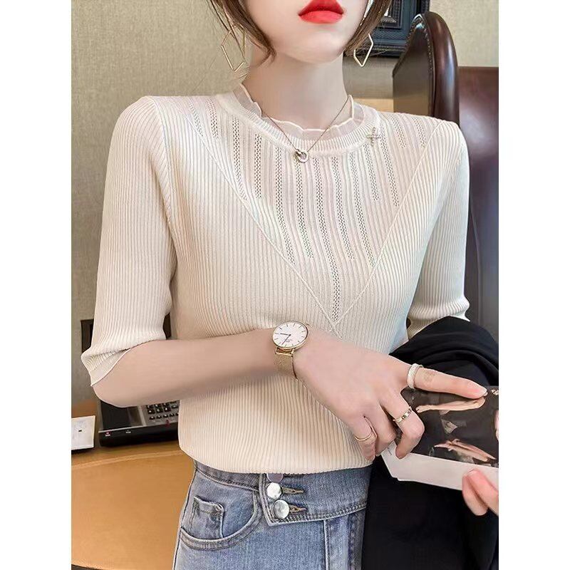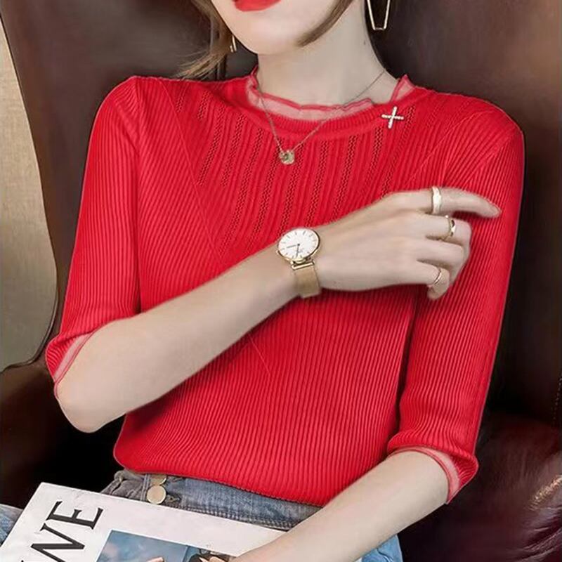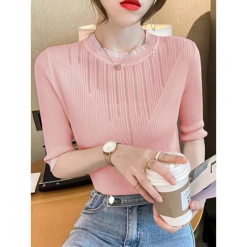 夏半袖 Tシャツ服 O ネックスリム Tシャツ中空ニットトップスピンク Tシャツ ショート ハーフスリーブ サマー 夏物 Oネック