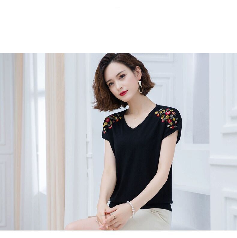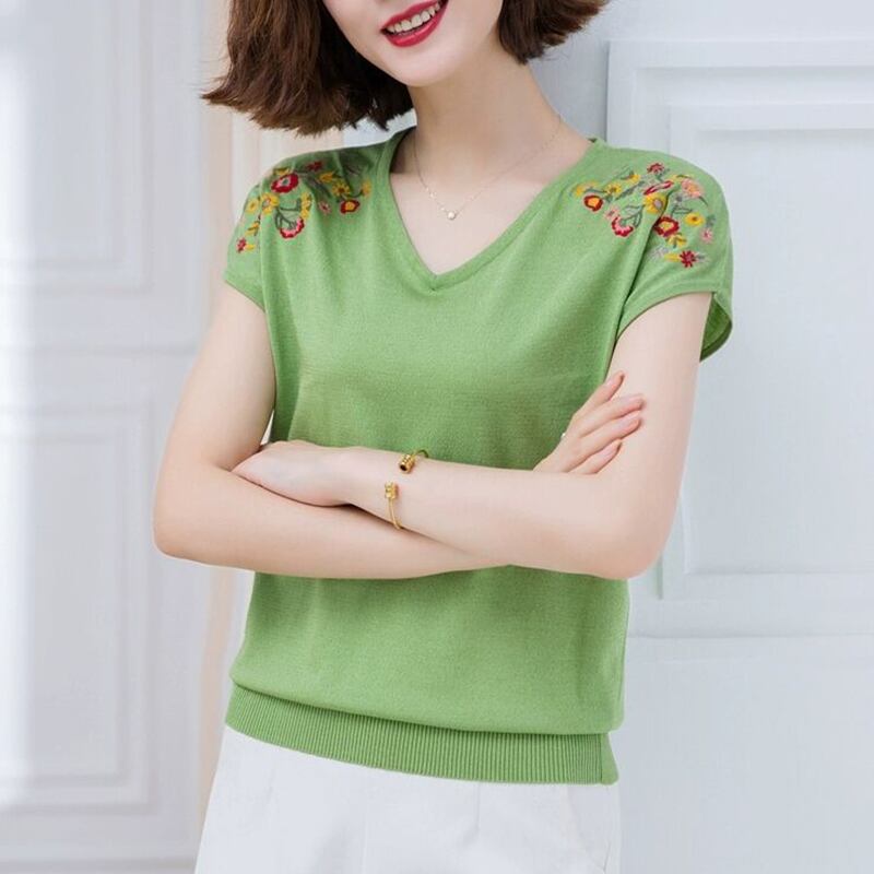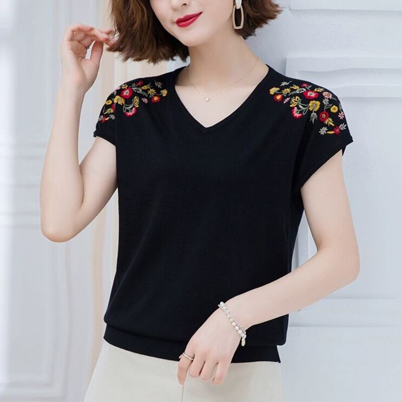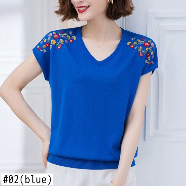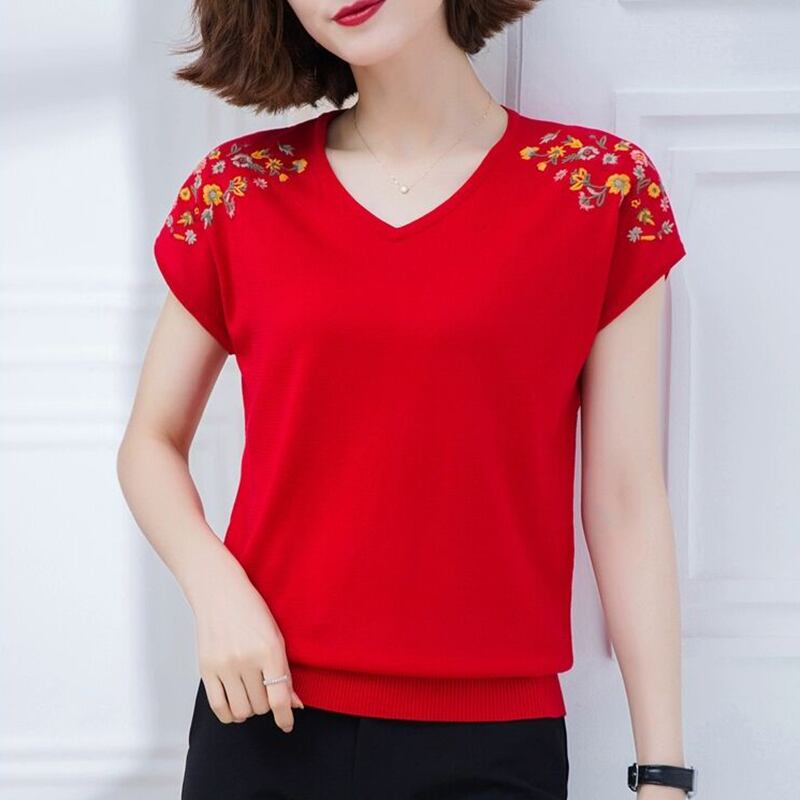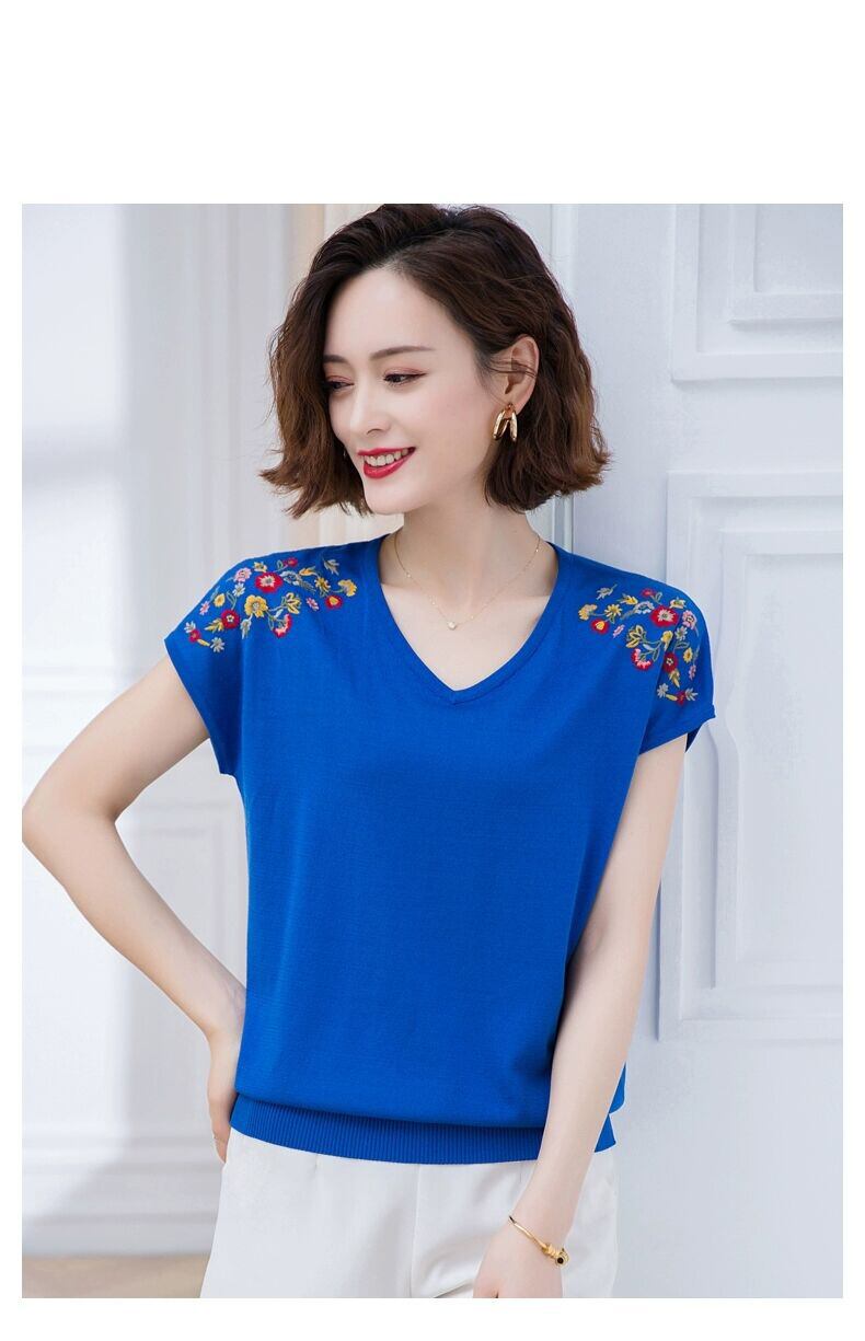 アイス V ネック薄型 Tシャツ刺繍 Tシャツ半袖 Tシャツ夏レディース服ニットトップ Camisetas ショート ハーフスリーブ サマー 夏物 Vネック シルク