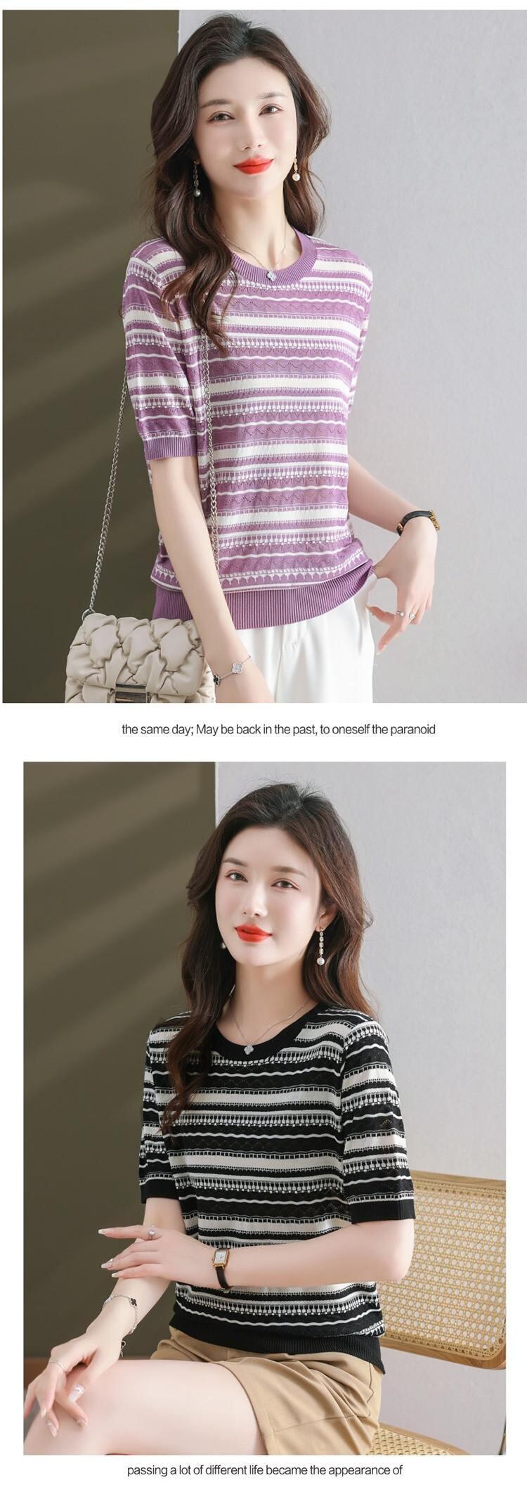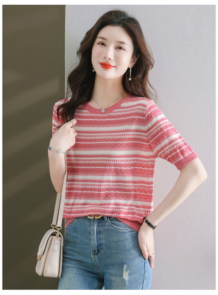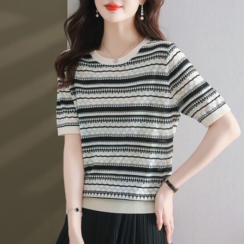 夏プルオーバー Tシャツストライプ O ネック半袖 Tシャツ中空アウト Tシャツルーズニットトップ ショート ハーフスリーブ サマー 夏物 Oネック