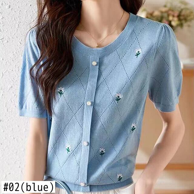 夏半袖 Tシャツ中空アウト O ネック Tシャツ Tシャツ刺繍ニットトップス ショート ハーフスリーブ サマー 夏物 Oネック