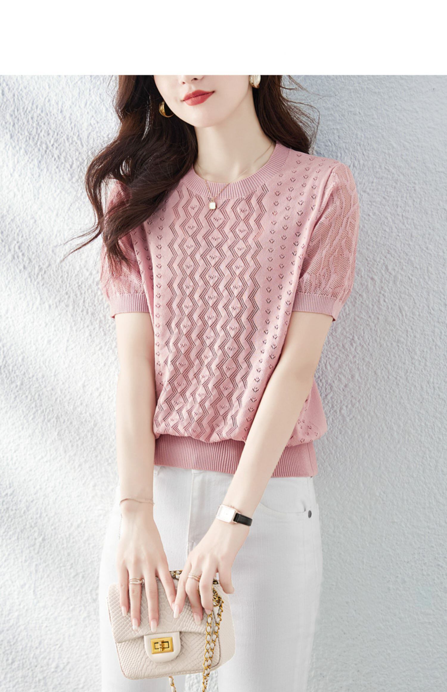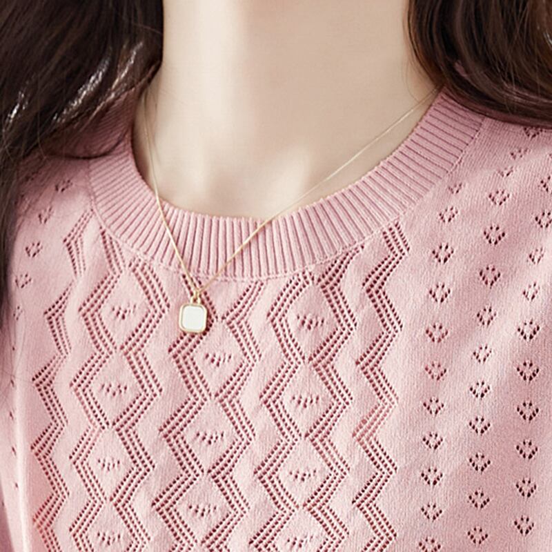 中空アウトニット Tシャツ夏服プルオーバー Tシャツ半袖 O ネックトップピンク Tシャツ ショート ハーフスリーブ サマー 夏物 Oネック