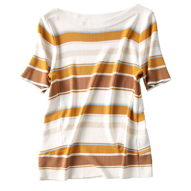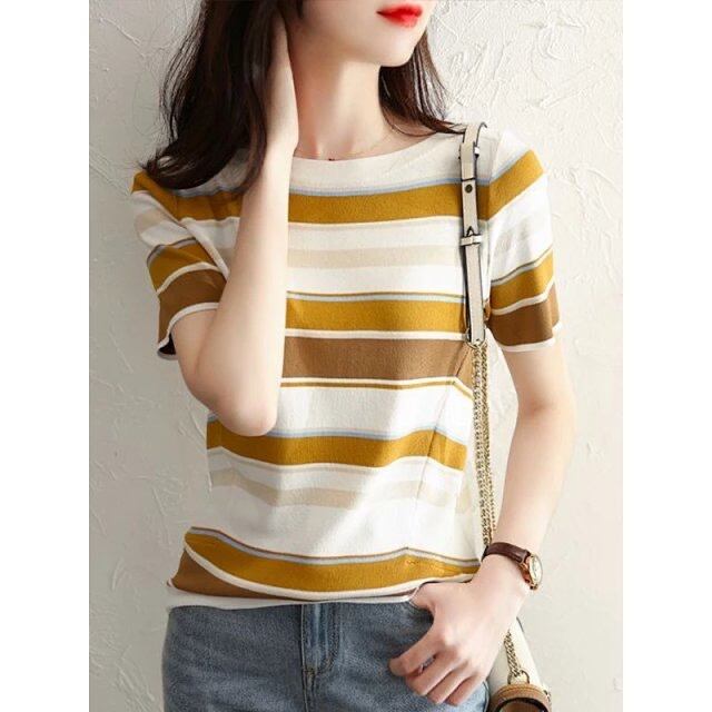 ストライプ Tシャツ半袖 O ネック Tシャツ緩い薄いプルオーバー Tシャツ夏服ニットトップス ショート ハーフスリーブ サマー 夏物 Oネック