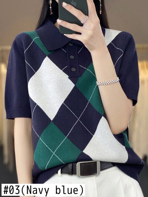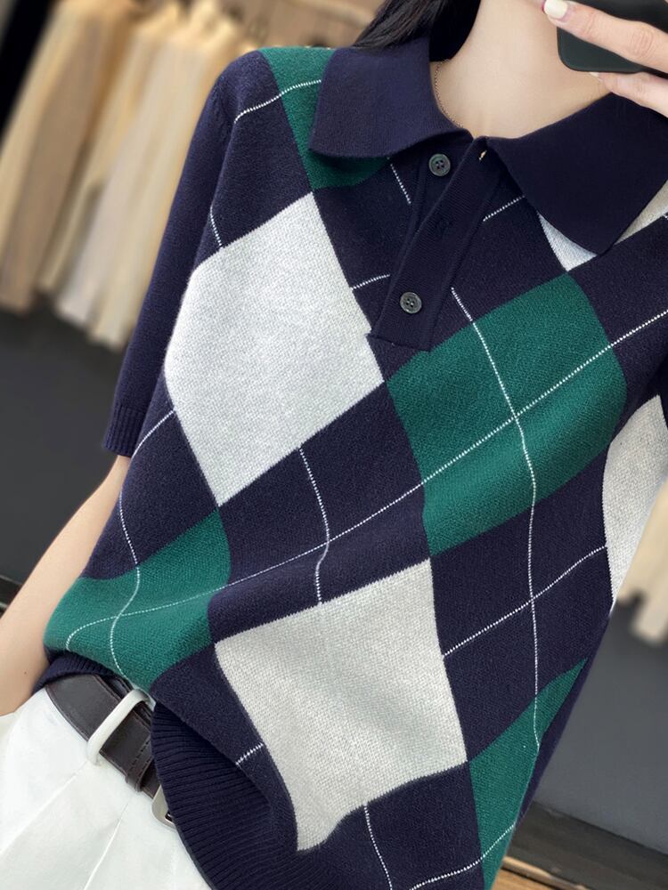 プレッピースタイルチェック柄 Tシャツターンダウン襟ニットトップス半袖 Tシャツ夏 Tシャツ Ropa デ ショート ハーフスリーブ サマー 夏物