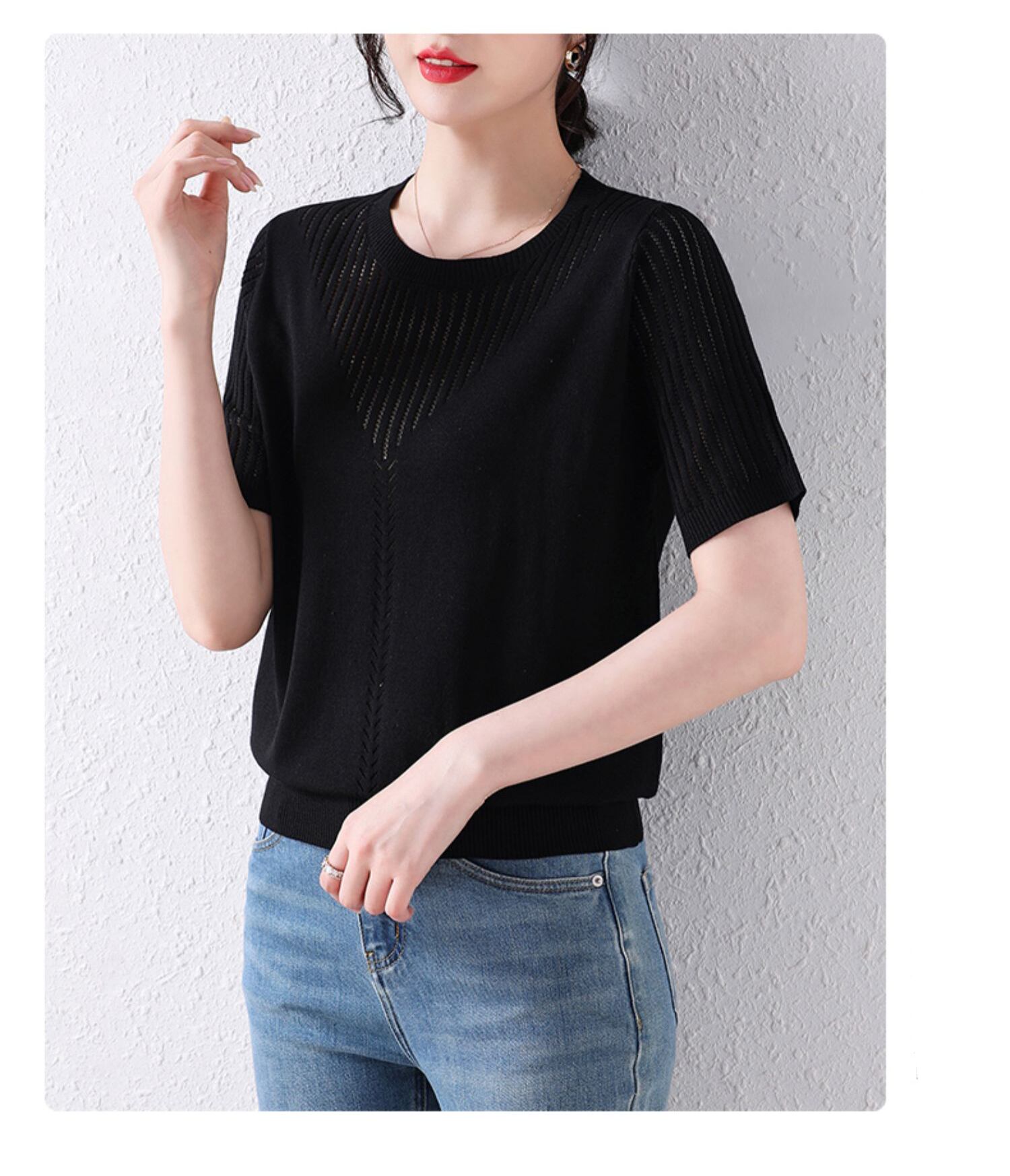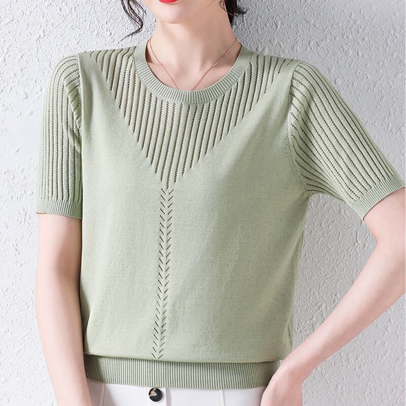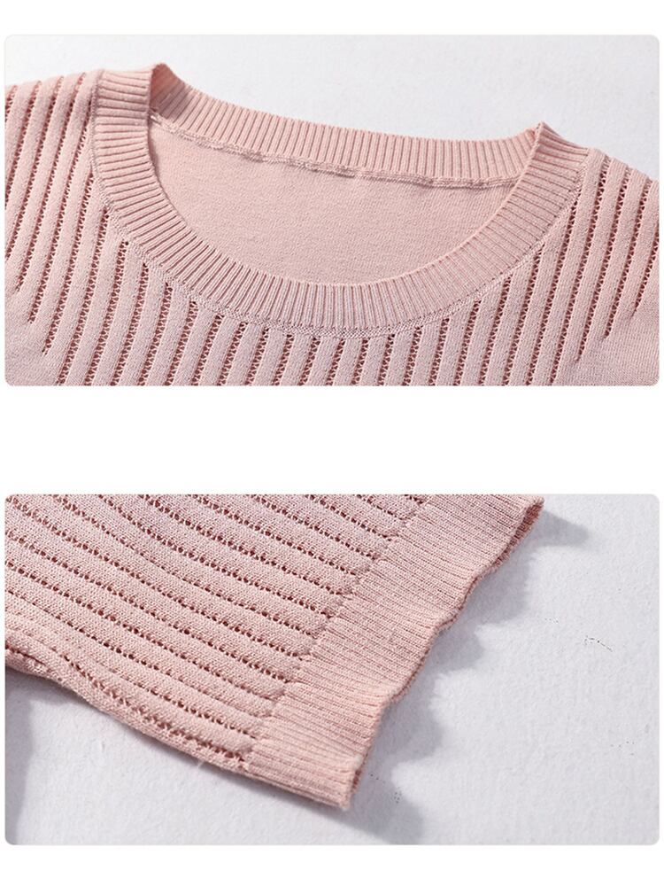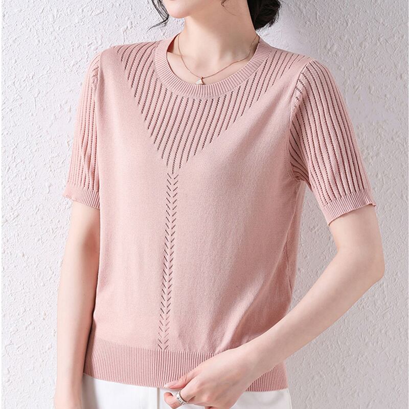 夏中空アウト薄いアイス Tシャツ O ネックニットトップス半袖 Tシャツピンク Tシャツ ショート ハーフスリーブ サマー 夏物 Oネック シルク